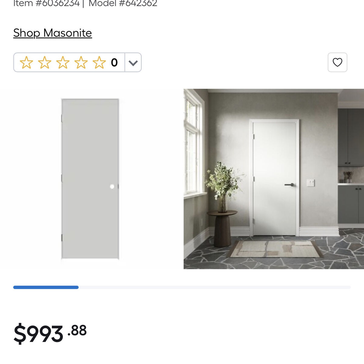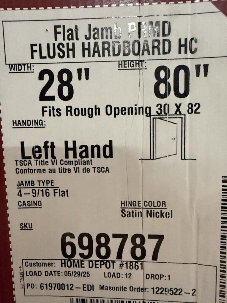 Masonite 28 In. X 80 In. X 4-9/16 In. Primed Flush Single Prehung Interior Door Left Hand Flat This is new, but will need to be primed and painted Located in west valley city