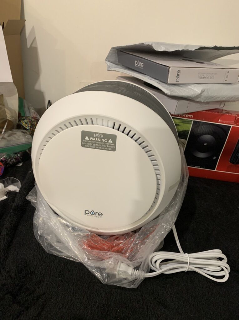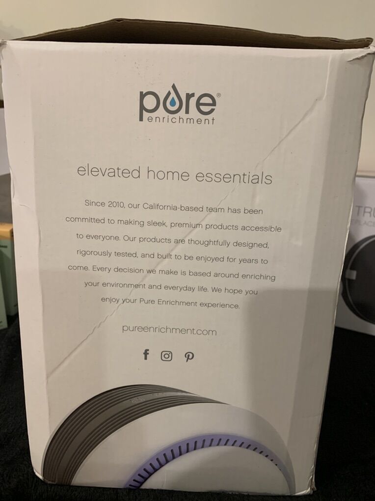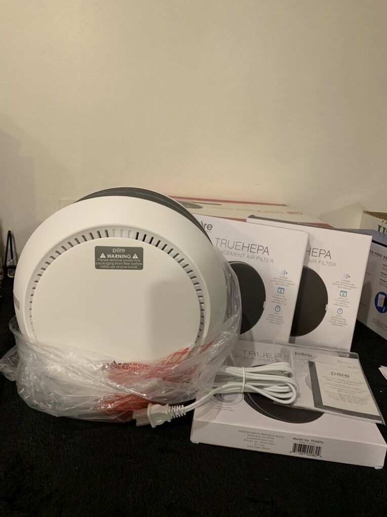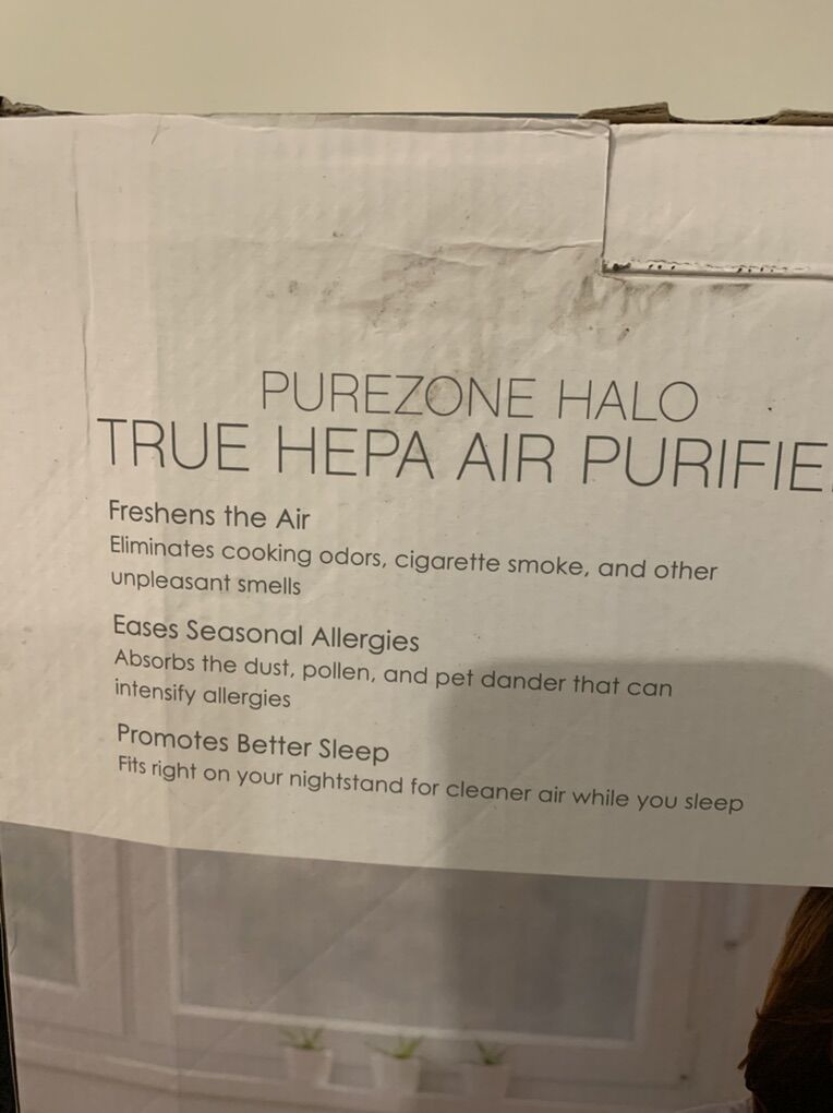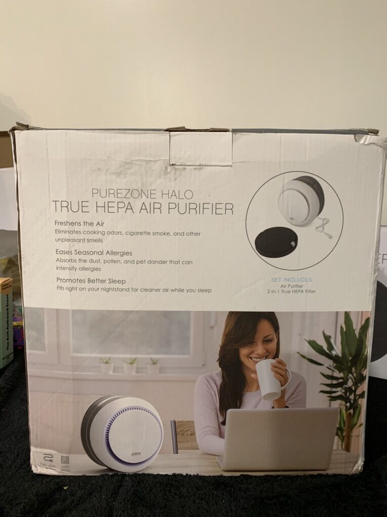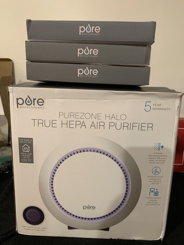 Pure zone halo true HEPA air filter with two stage air purification captures 99% of dust pollen pet dander smoke and more. Whisper quiet operation Warren silently at 28-52 dB For Home and office Jughes. Ideal for Rooms up to 100 feet. Has a soft glow mood light, with two levels of brightness Brand new in the box. The unit in the box has a filter in it and I’m including three brand new replacement filters as well. Depending on your environment, that is enough filters to probably last you for two years. The filters don’t typically need to be changed except every six months unless you have a house full of pets or something extreme