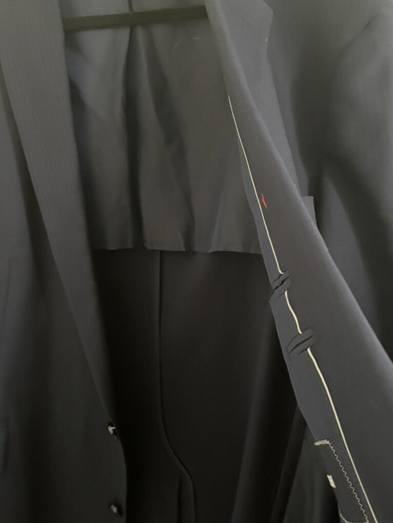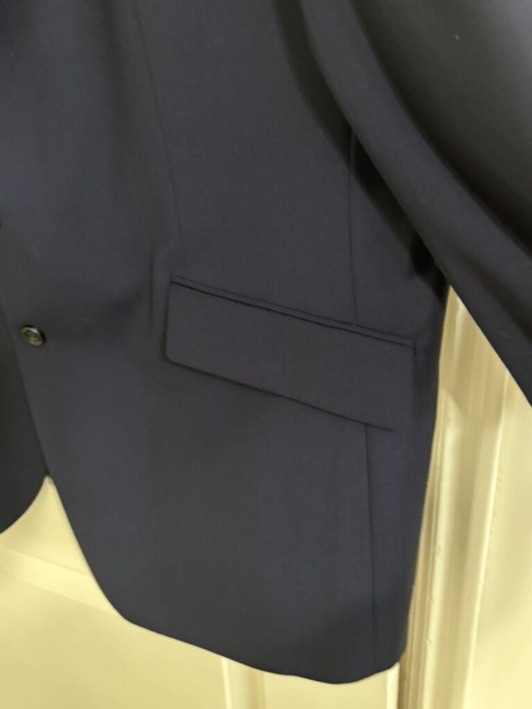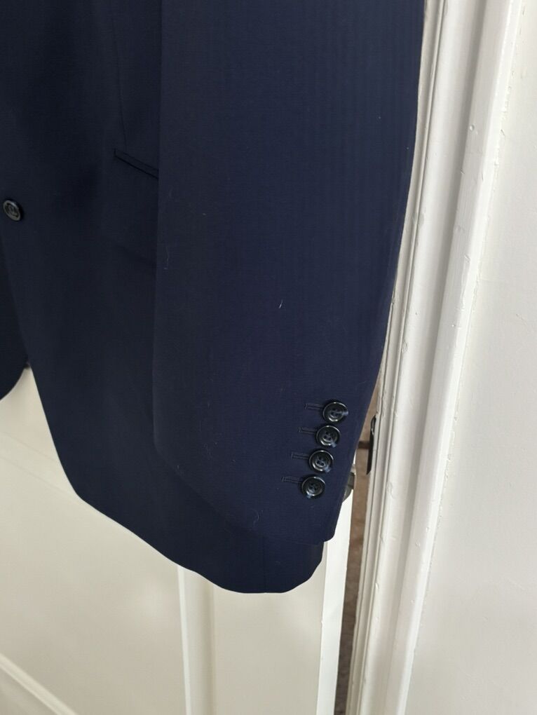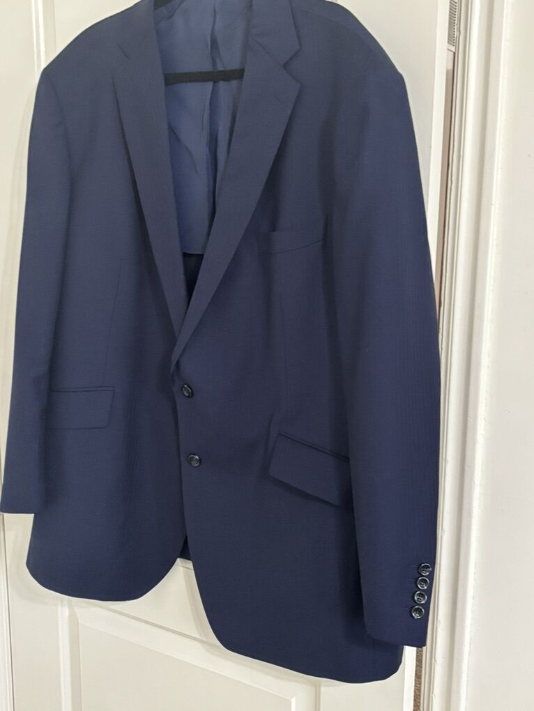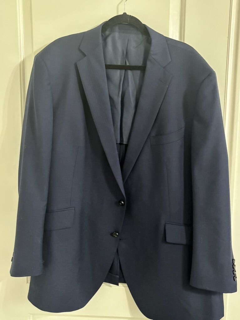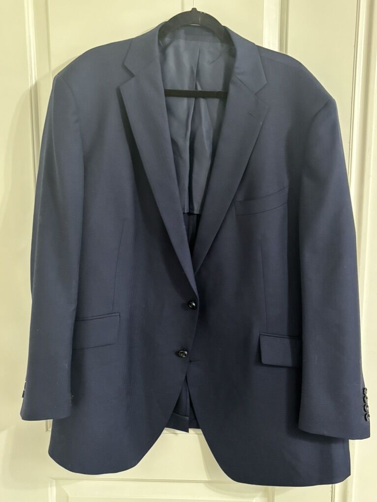 4X Tailor Cooperative CFH Navy-Blue Tailored Suit Blazer Sleek the Interior Sides are Line. Single-Breasted Front, two black buttons. The jacket is a navy‑blue tailored suit blazer with a classic notch‑lapel design, featuring two front flap pockets and four black buttons on each sleeve for a sleek, professional look. The sides are lined interior, a single‑breasted front with two black buttons for closure, and the sleeves are long with functional button cuffs, giving it a polished, versatile style suitable for formal or business settings. The blazer made from a smooth, medium‑weight fabric, has a structured shoulder fit Maybe 54”Length No advance payment Payment and pick up are at the same timeaybe