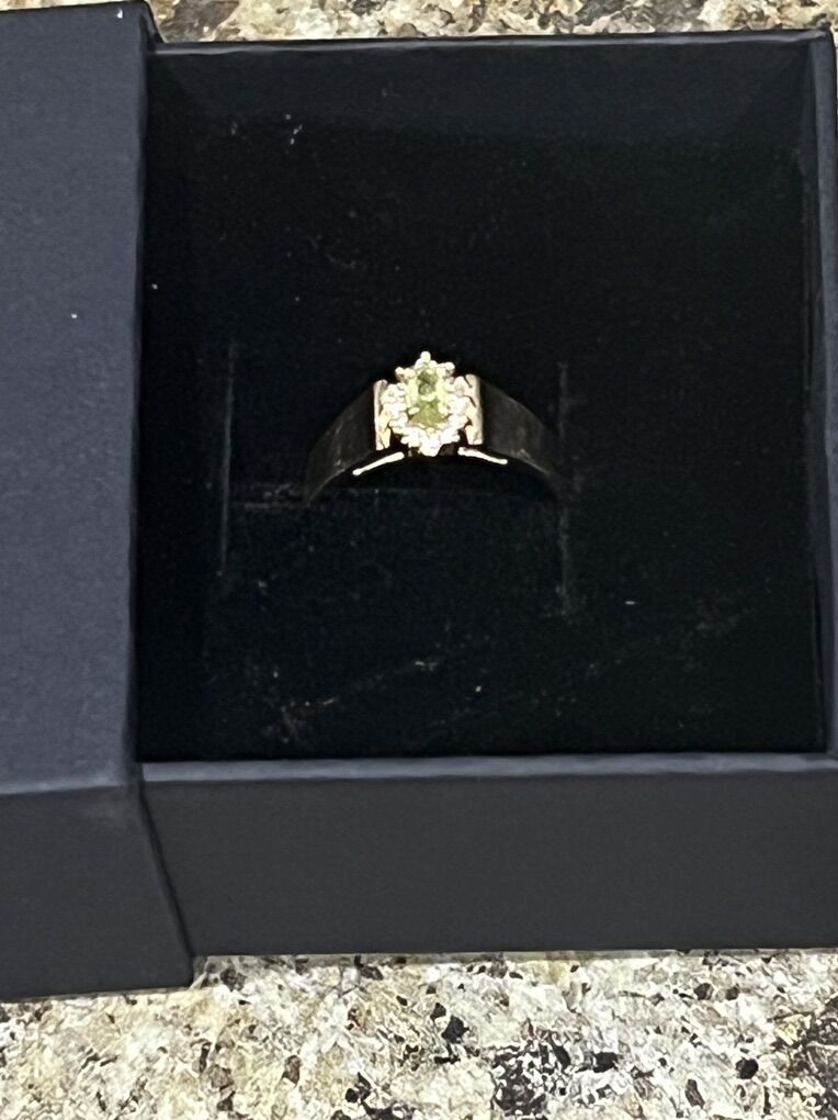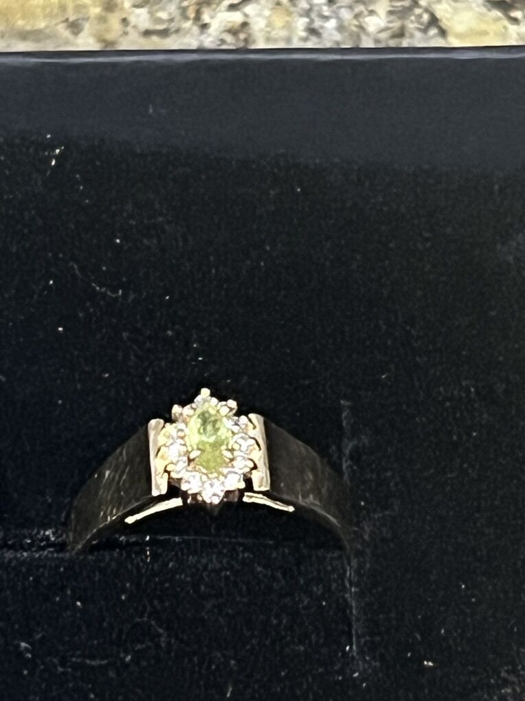 This is an oval-cut natural peridot and diamond halo ring in 14k yellow gold.