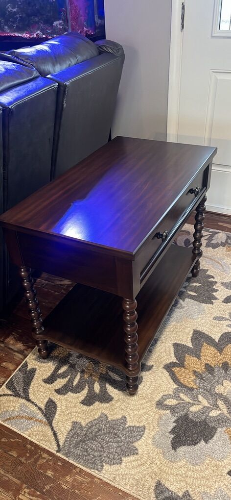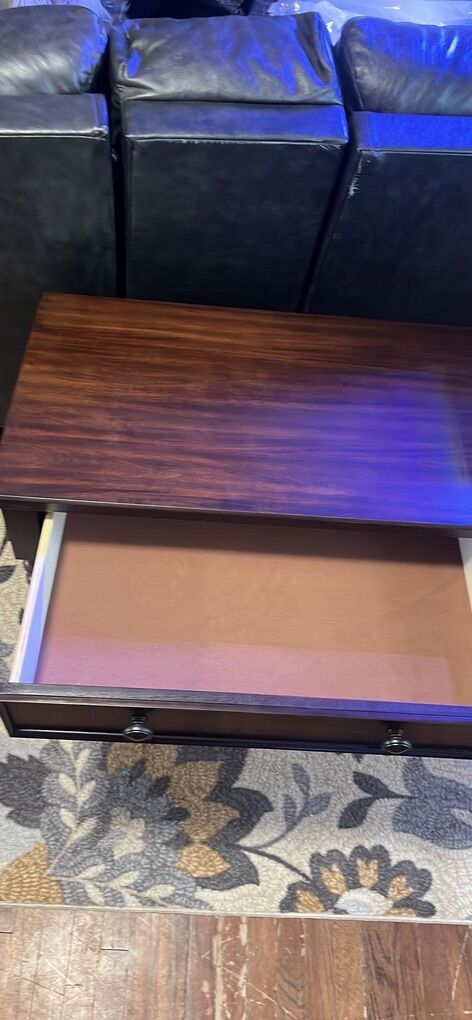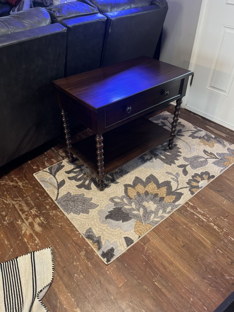Solid wood frame & legs, MDF with Veneer Top, Drawer & Shelf Metal knobs & drawer glide.
