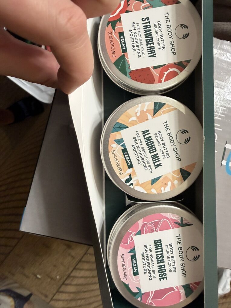 VenmoNew The Body Shop Slather & Smooth Body Butter Trio - Strawberry, Shea, British Rose. 50ml each. I got these as a gift but I have sensitive skin and can’t have anything scented.