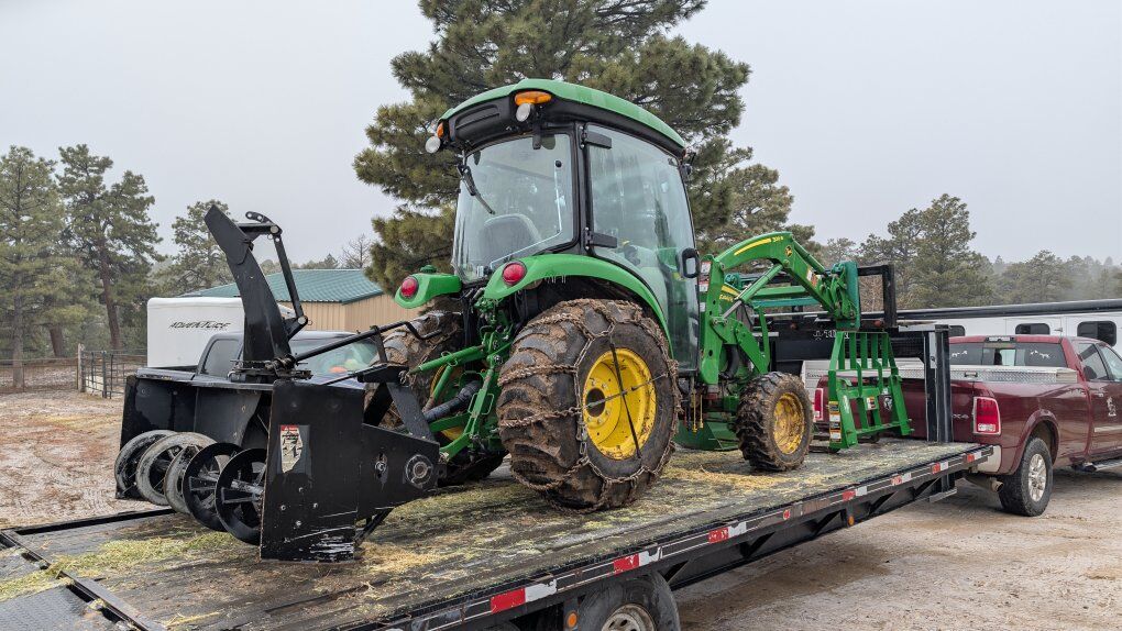 Included with it: REAR TIRE CHAINS & FORK LIFT ATTACHMENT & BUCKET