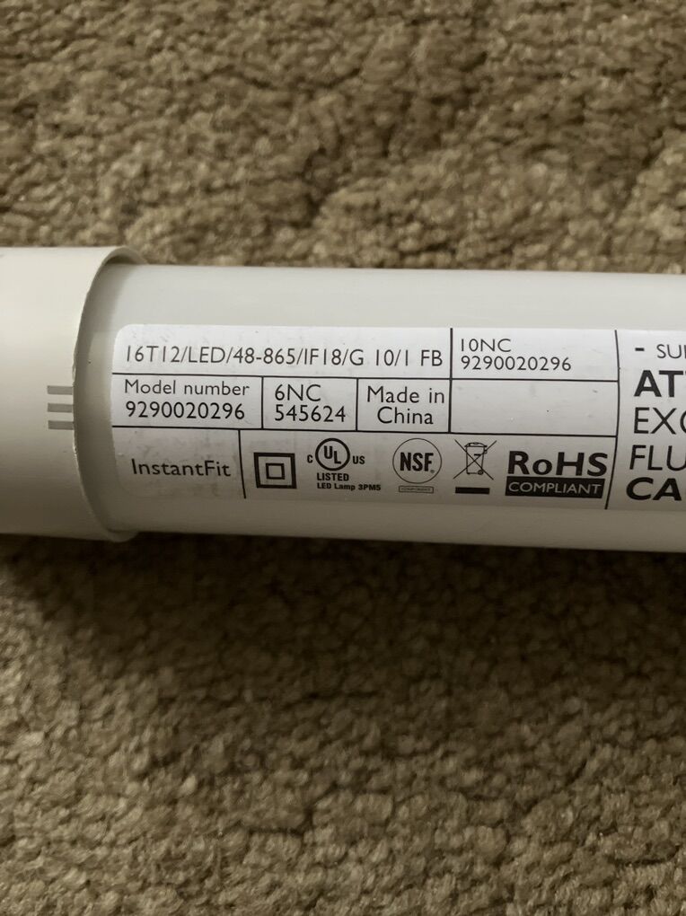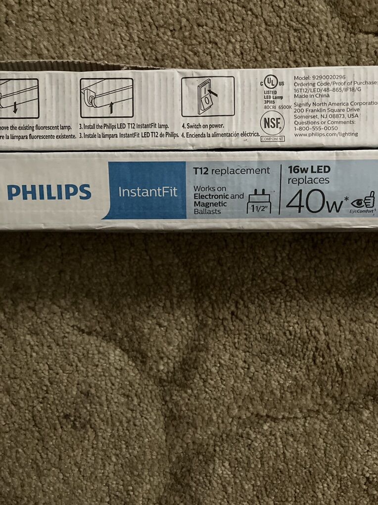 I have two Phillips T 12 LED fluorescent replacement bulbs for fixtures with electronic or magnetic instant start ballast, they are 40watt equivalents using only 16 watts. Both bulbs light up but my ballast wasn’t compatible.