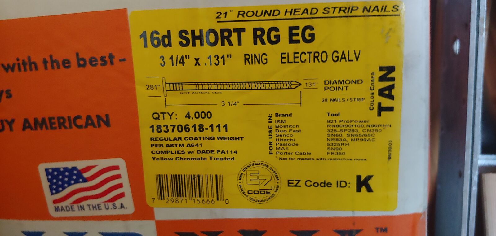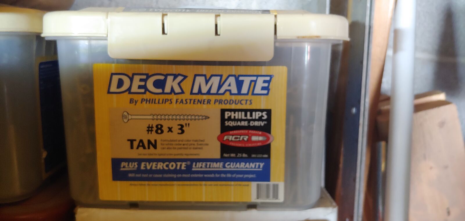 3in.x#8 deck screws tan, 25lb, $60.00 ea. box, 16d Ring Galv. #4000.00 $100.00. 2 3/8in 8d #5000.00 $50.00 ea. box, All new in Box.