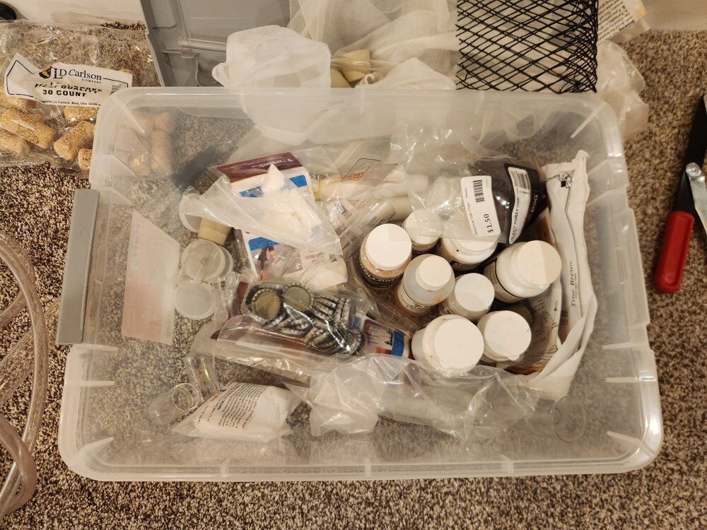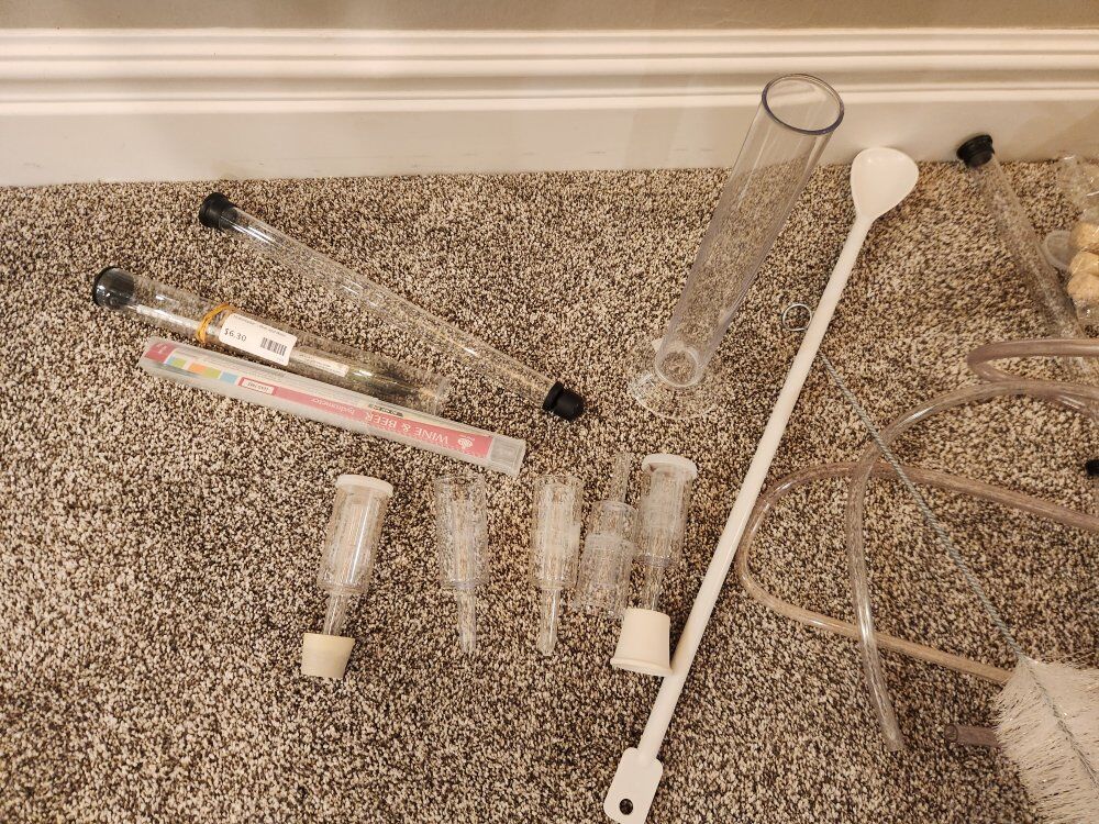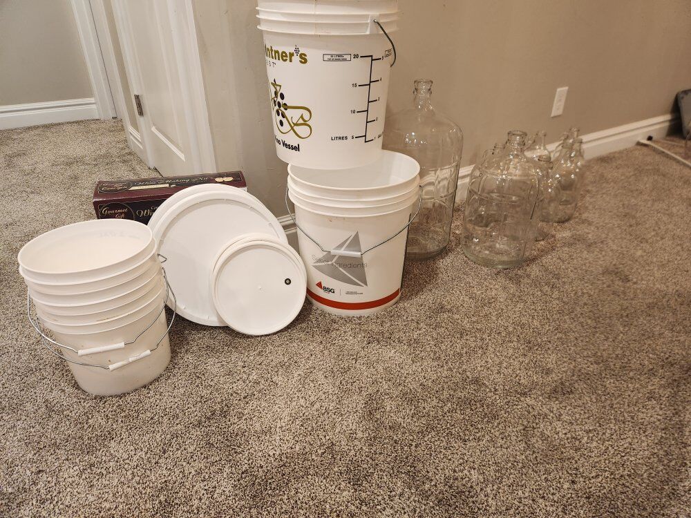 ready to start making your own beer or wine? large set of supplies 2 x 5gallon buckets with seal lid 3 x 1 gallon bucket with lids 1 x 5 gallon glass carboy carbon1 x 3 gallon glass carbon 4 x 1 gallon glass carboy carbon3 x half gallon glass carbon 2 x bottle cappers campers2 x hydrometers 1 wine kit lots of chemicals, stoppers, caps, corks & other misc. items