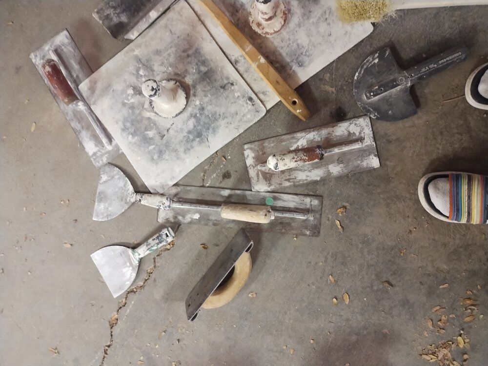 2 hawks $5 each mixer paddle $8 brush $3 bullnose tool $4 sanding block $3 2 6" knives $9 12" trowel $8 14" trowel $10 16" trowel $12 texture knockdown knife $10
