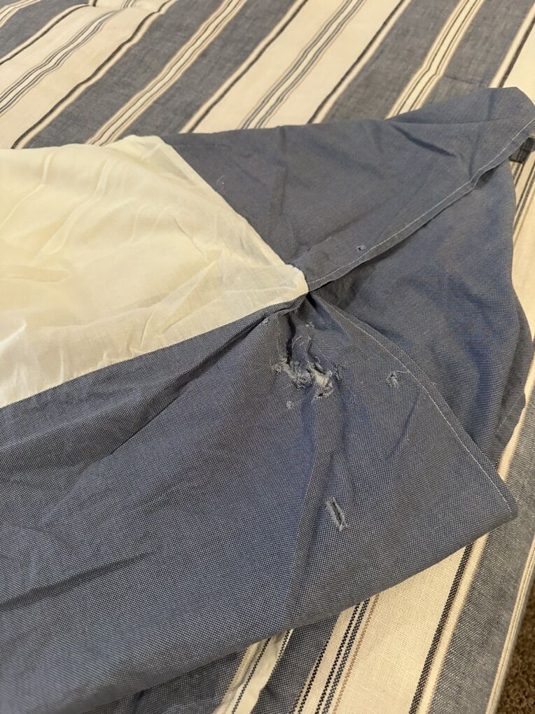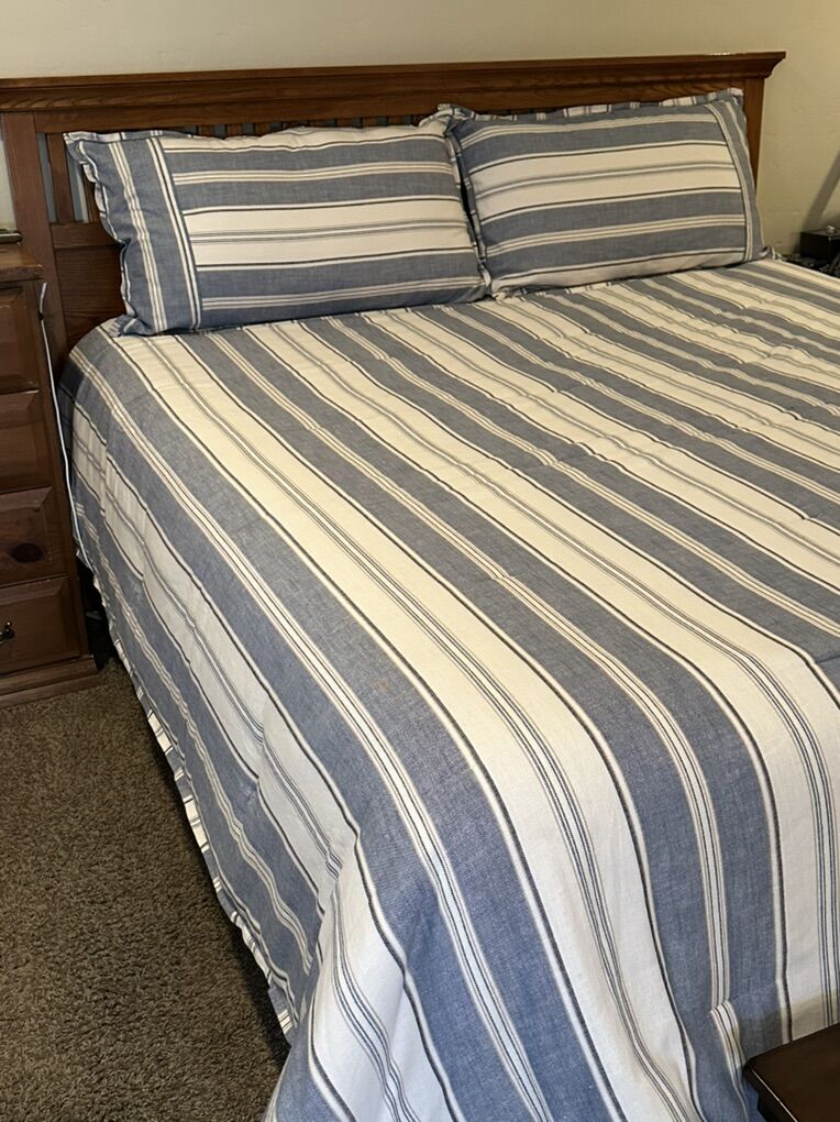 VenmoThis is a lightly used comforter for a king sized bed. It is like new no stains or problems at all. Shams come with it, but not pillows inside shams. The comforter and shams are reversible to blue pattern in the pictures. There is also a matching skirt in ok shape, just a few holes in a couple places as seen in picture of the skirt. Asking $35 Cash or Venmo. Text is best or call, if no answer leave a message and I will call you back.