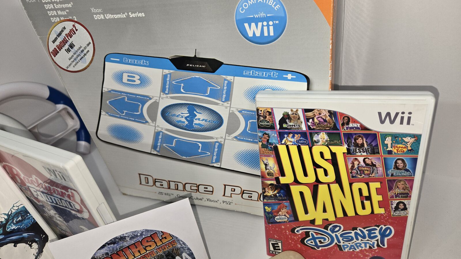 This lot also includes a "tossed in" Pelican Dance Pad, which is supposed to be compatible with Wii, but requires a special adapter that is NOT included.