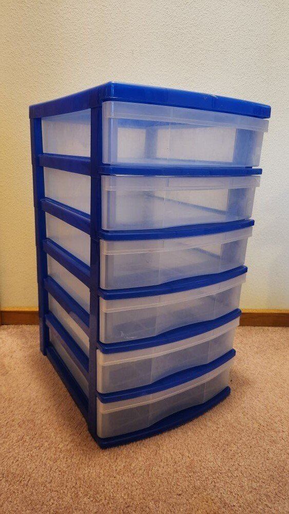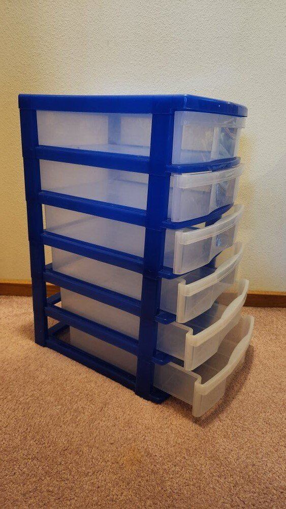 VenmoLike new, in great condition. Bought for $60. Selling for $30. Overall dimensions, 17" deep by 13" wide by 25" tall, with six 11"x16" drawers. Clear and royal blue in color.