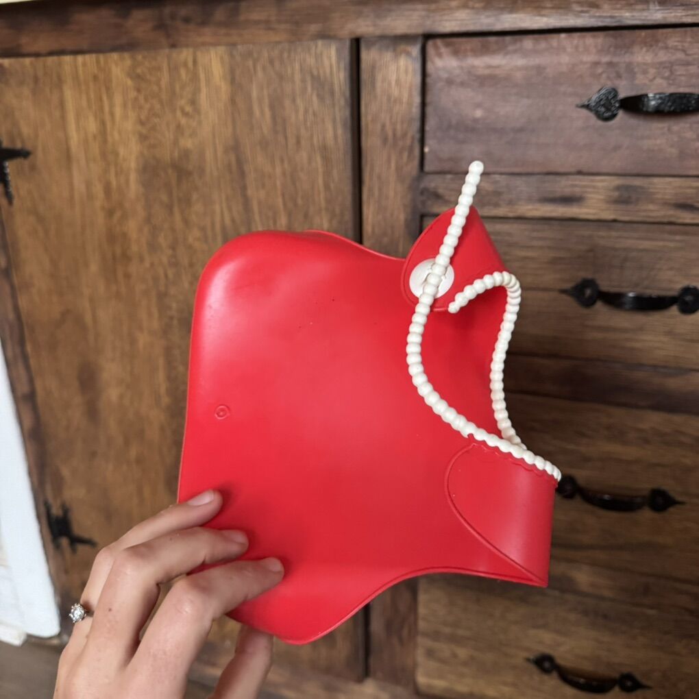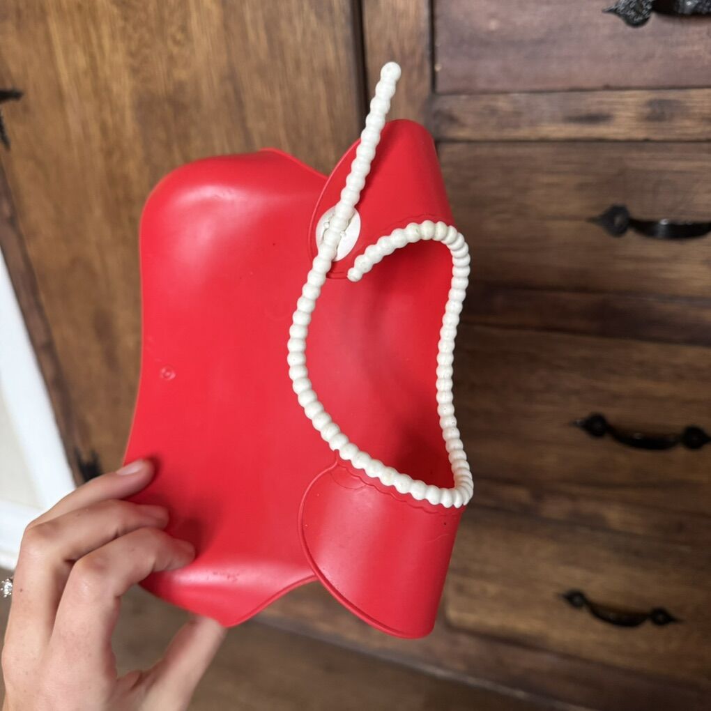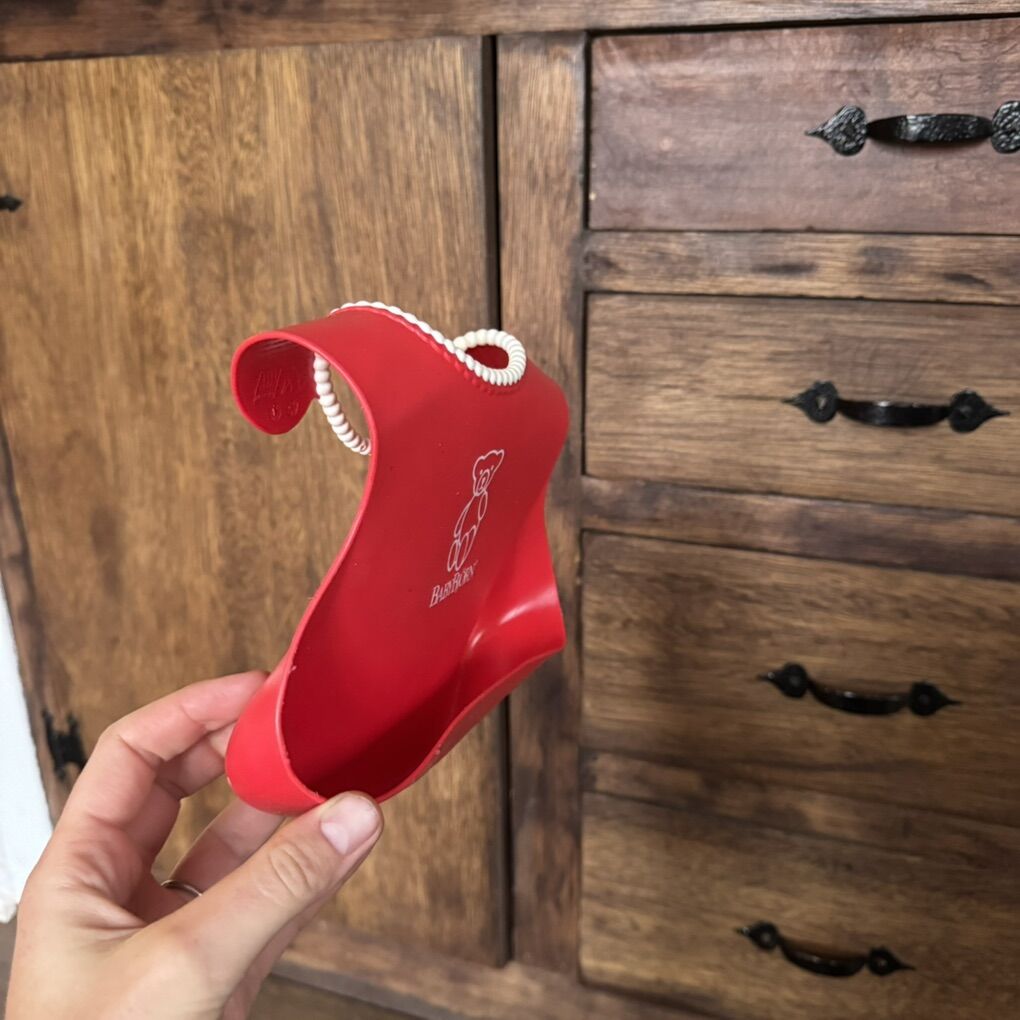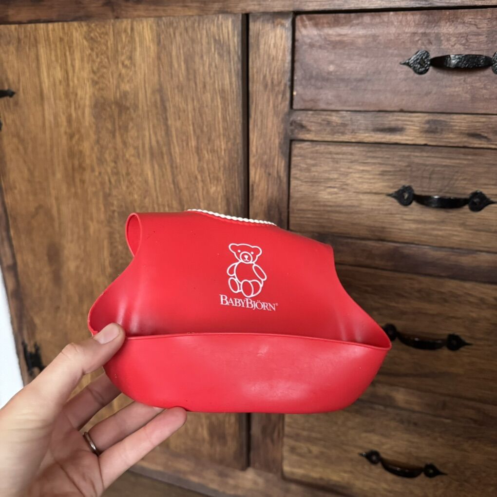 Baby Bjorn Food Catching Bib Silicone Red w White Beaded Rim Deep Catch Pocket