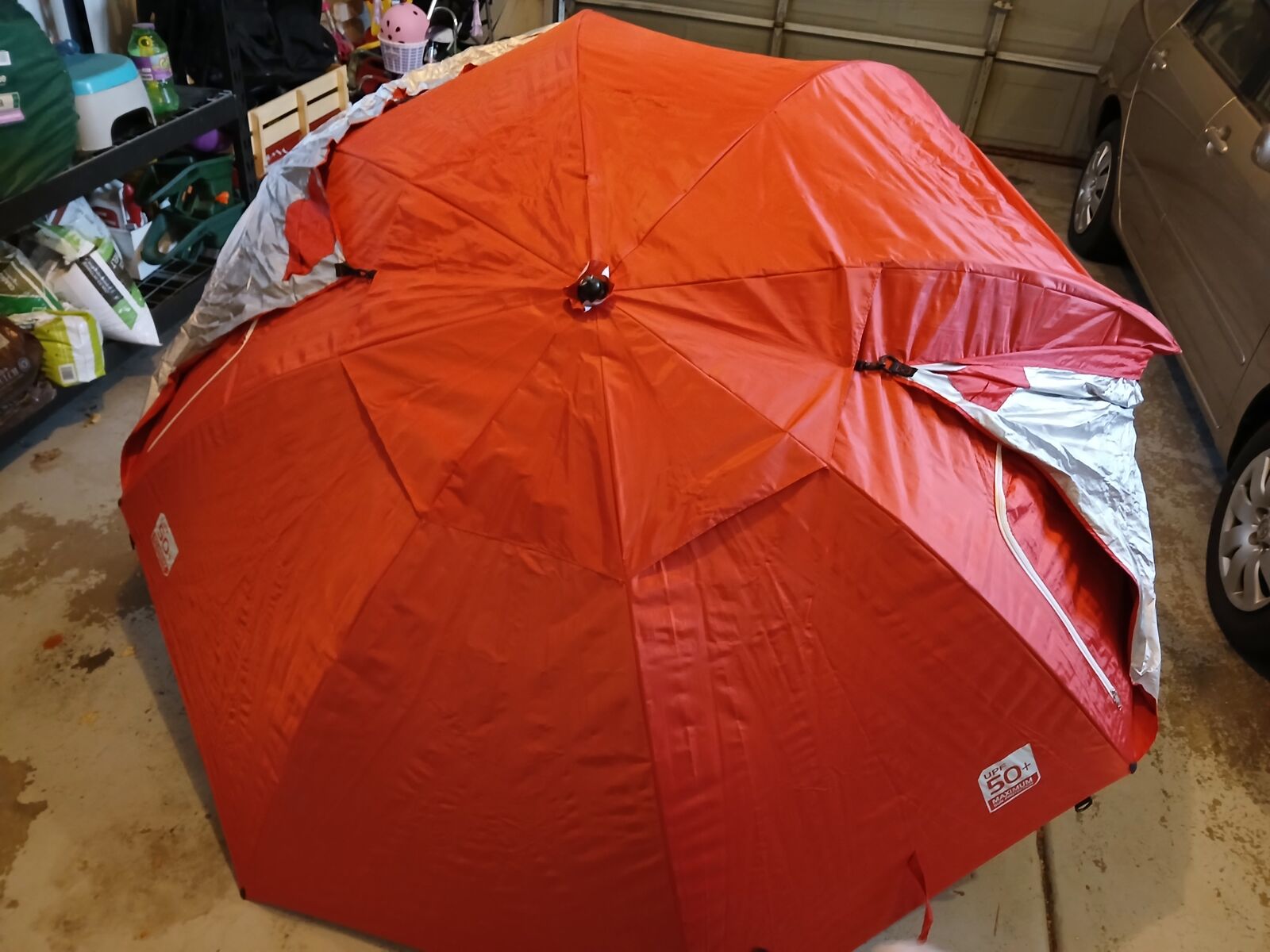 VenmoGreat condition. 8' Sport-Brella. Custum carrying bag, tent stakes in small bag, extendable center pole all included. Has seen no use except setting up in the backyard 2-3 times. Windows zip open and have screen mesh. One flap comes down on either side to provide fuller coverage on the bottom-left and bottom-right sides. No rips, tears, sand, etc.