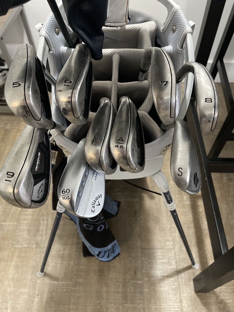 Driver- Callaway Paradym 3-wood- Titleist TSI2 2 Hybrid- Warrior (Custom) Irons- Callaway Rogue ST Max OS 60 degree- Callaway Jaws Sand Wedge- Adam’s Golf (56 degree) Putter- Wilson Infinite Buckingham Comes With range finder, golf bag/cover, driver/3 wood/putter covers