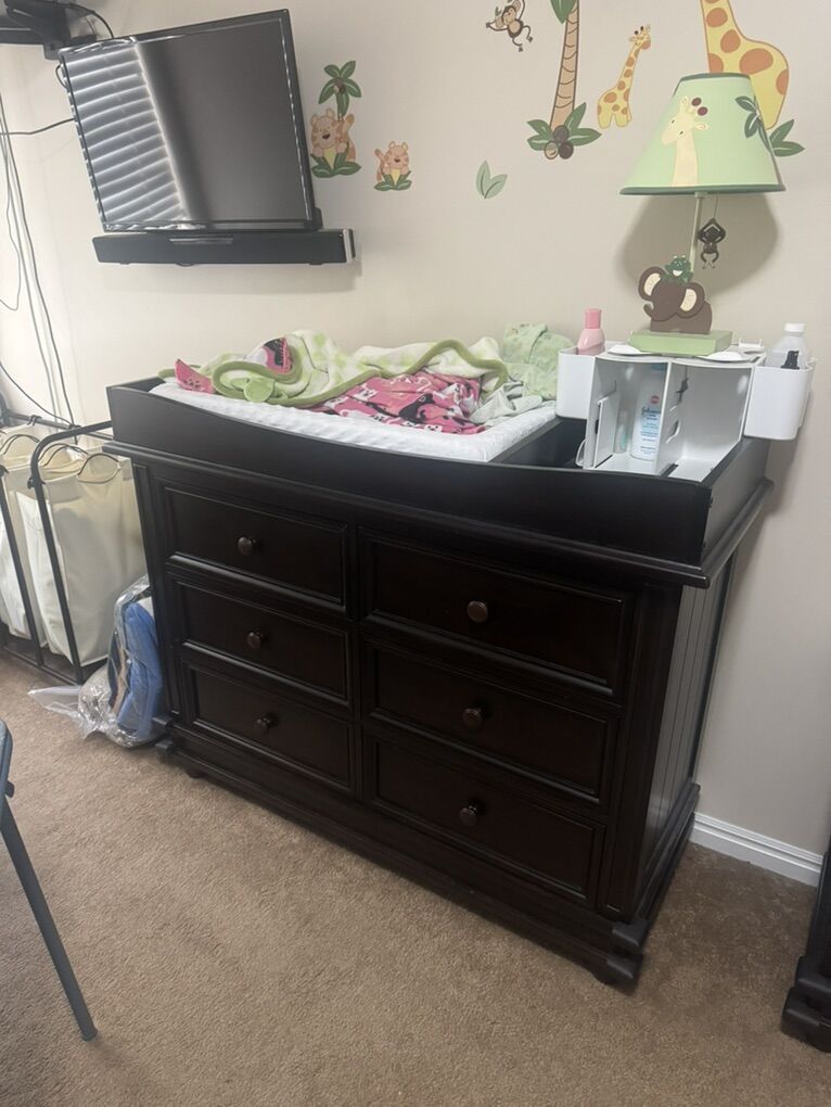 ApplePayCrib: Solid wood. Converts from crib to toddler to full size adult bed. All parts needed included for this. Bed rails for full bed still in box never used. Really nice mattress with it. Crib mattress level can be raised or lower for growth of child. Dresser: Solid wood. 6 drawers. Changing table topper with pad included. Nightstand: Solid wood All items used very little. No large stains, scratches, or dents. These are very large and heavy items. Pick up only.