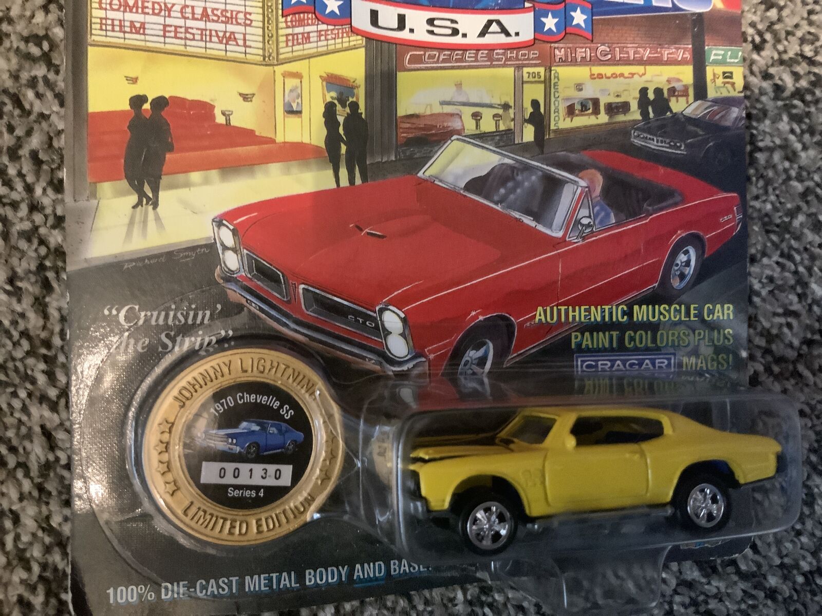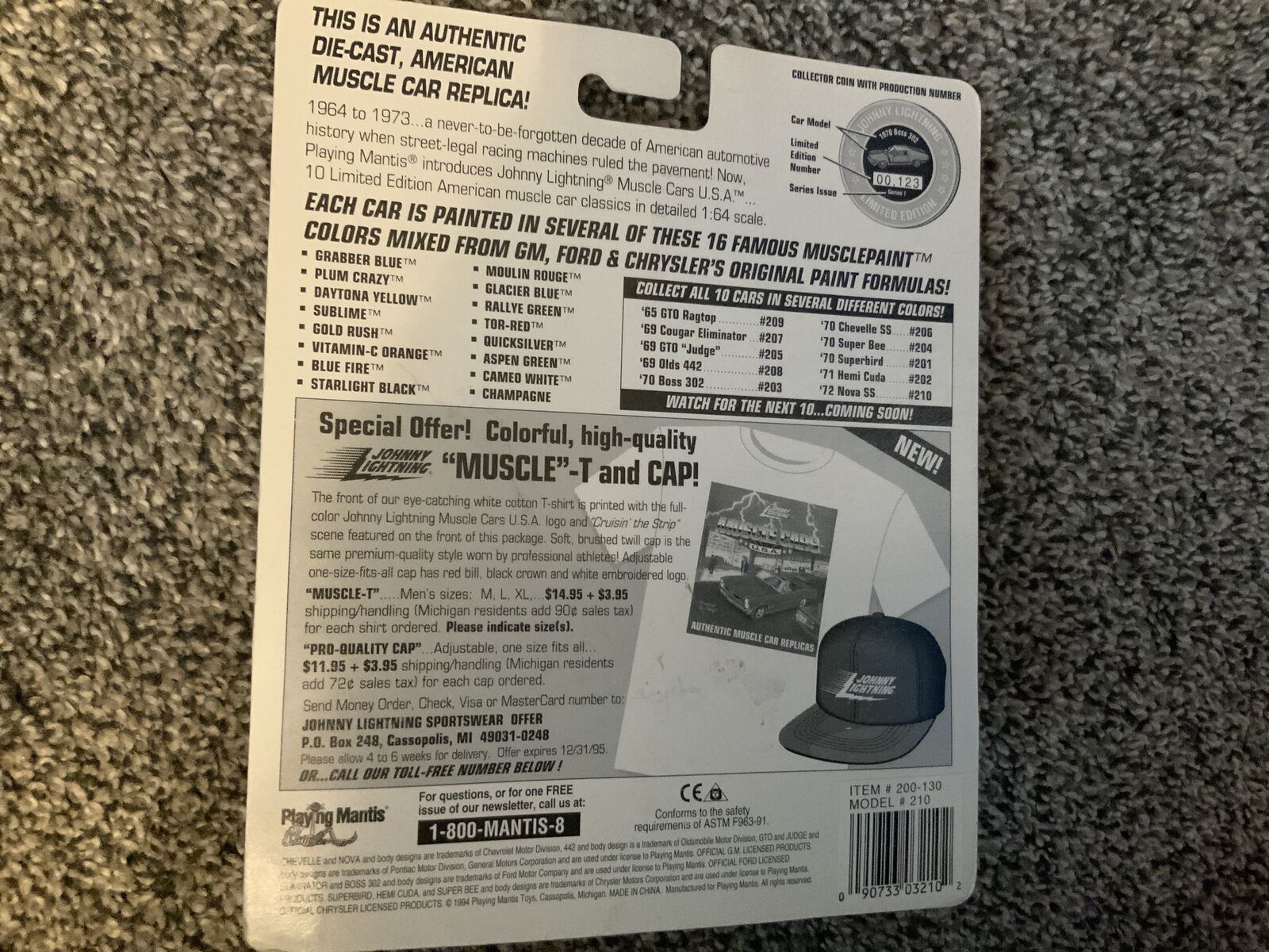These are very special cars. They are limited editions from Johnny Lightning. They are all Muscle Cars and were issued 30 years ago! I mainly collect Hot Wheels so I only bought low number cars. Please see the photos showing the number. I have Numbers 15, 16, 29, 63, 68 and 130. I believe they are painted in factory colors (See the last photo of the back of one of the cards. I am asking sixty dollars for the entire collection of 6 cars. I prefer texts. I live in Nephi. If you buy these, I have something else you might be interested in. I have two GTOs from SeriesThis 4 and 5 with the same serial number 42!