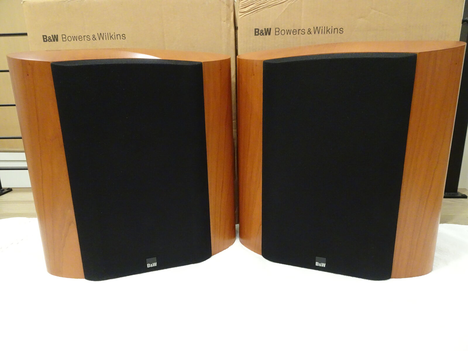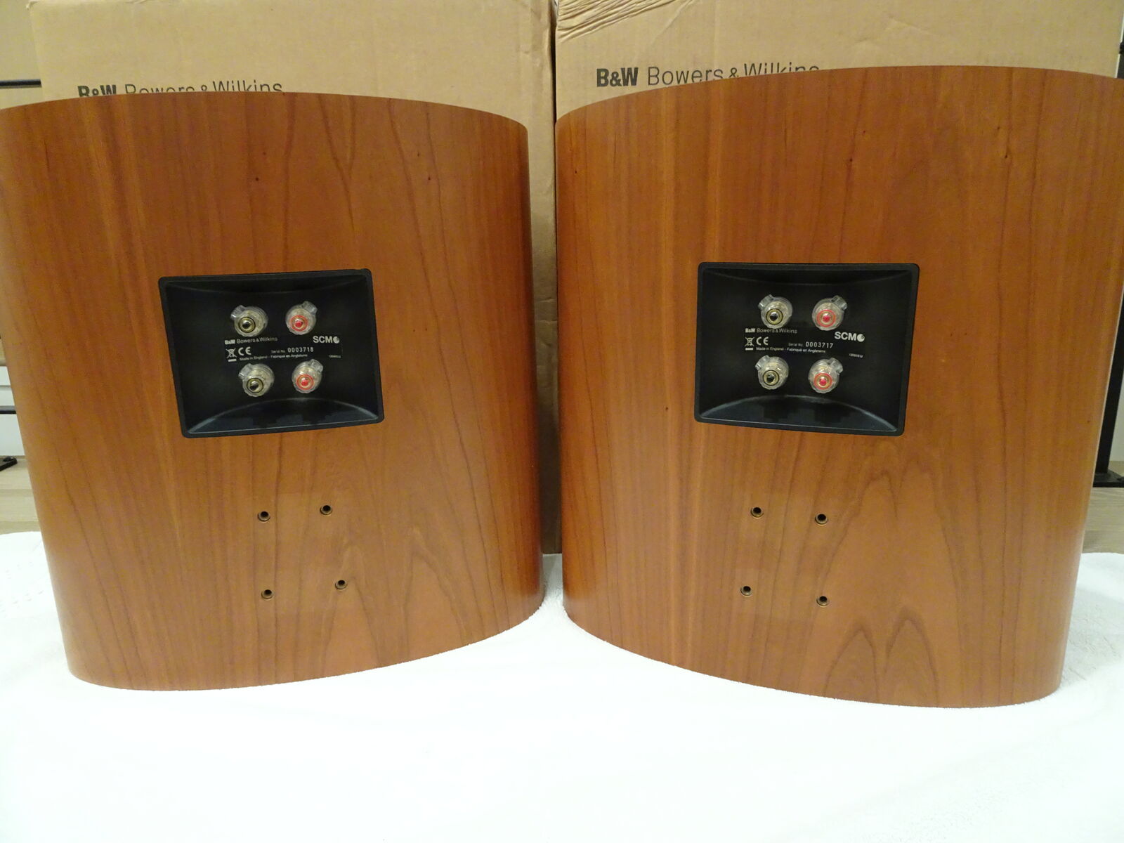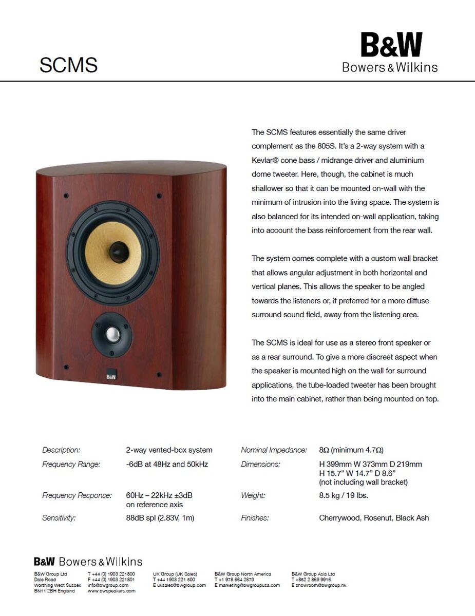 VenmoB&W Bowers & Wilkins SCMS speakers in cherrywood finish with consecutive serial numbers. Each speaker includes all original components (B&W wiring, grills, manual, mounting template, wall mount bracket and screws/tools) and the original box and packaging. Both speaker grills are pristine and have never been used. The wall mount brackets have wear from mounting. "The SCMS features essentially the same driver complement as the 805S. It's a 2-way system with a Kevlar cone base / midrange and aluminum dome tweeter." --B&W Original owner, used in a non-smoking, no-pet environment. The speakers are in excellent condition and sound great! I have two pairs available. Use as surround speakers or use two pairs as fronts and rears.