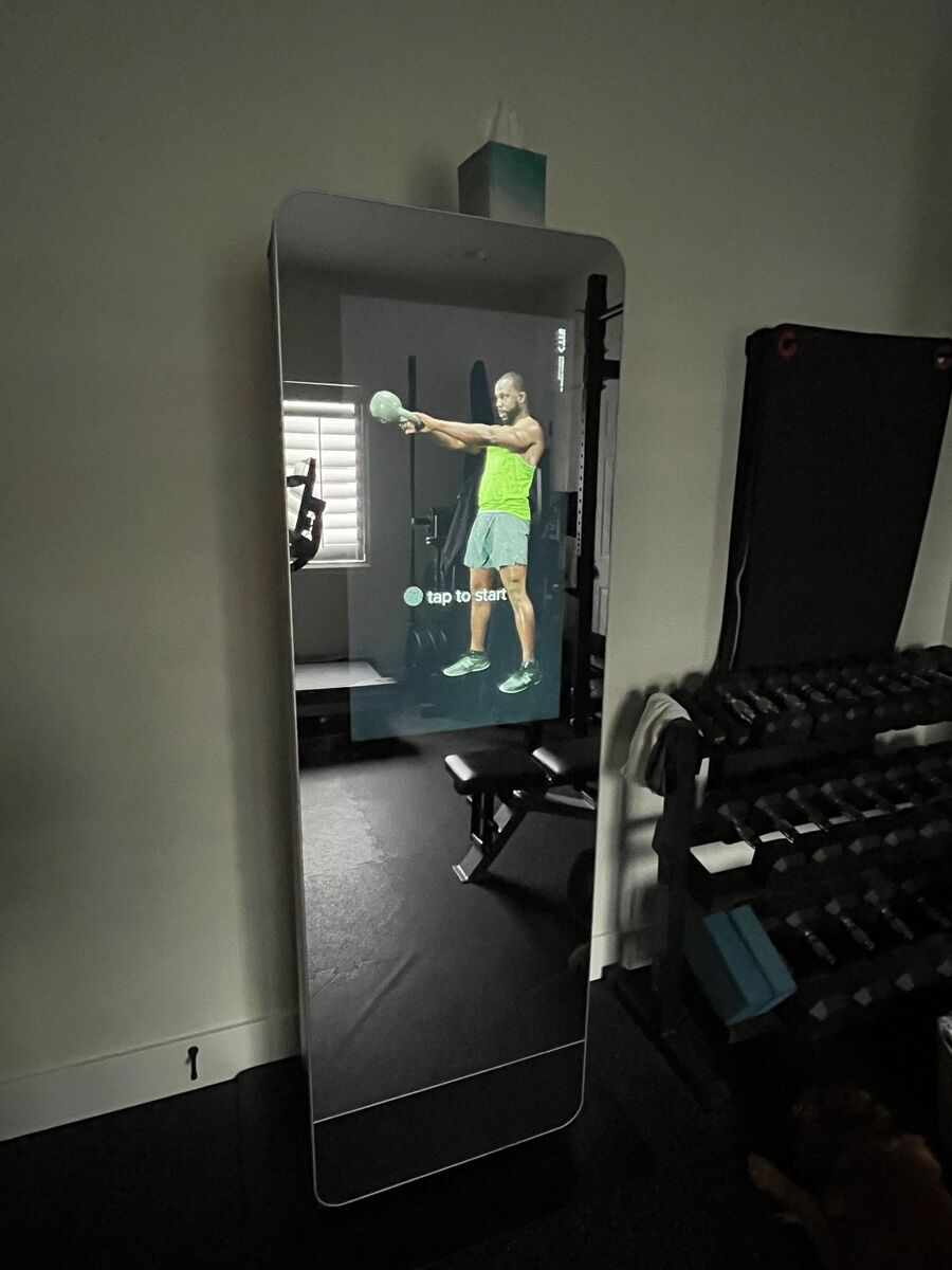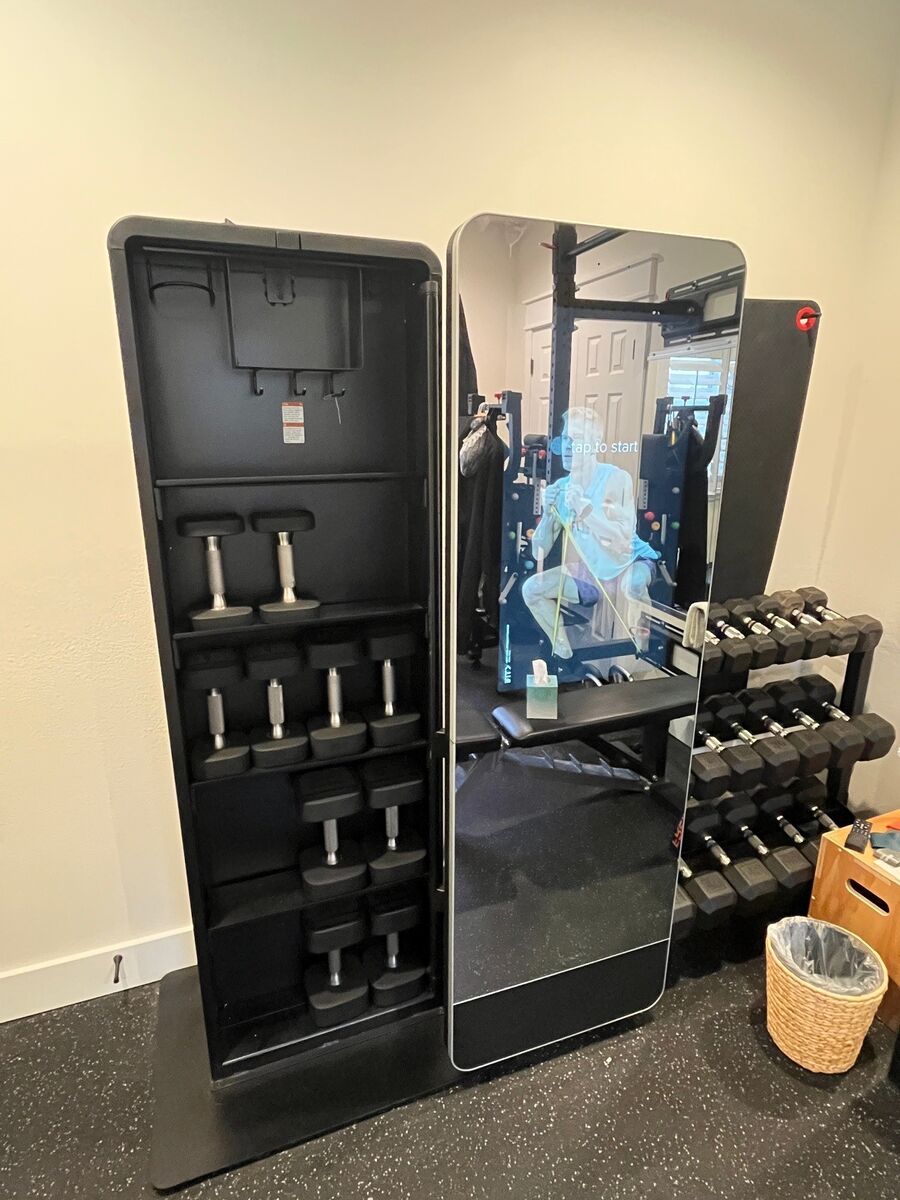 VenmoNordicTrack Vault Mirror (MR32-AR) Smart home gym featureing a large, rotating mirror with a hidden 32-inch HD touchscreen for iFit workouts. Has been reset to factory defaults. Interactive mirror with touchscreen for iFit workouts, letting you see form and trainer all at once (iFit subscription required). Integrated storage - mirror rotates to reveal shelving for weights, mats, bands, etc. Sale comes with the (5) pairs of dumbbells shown stored inside the mirror. Originally purchased in 2022.