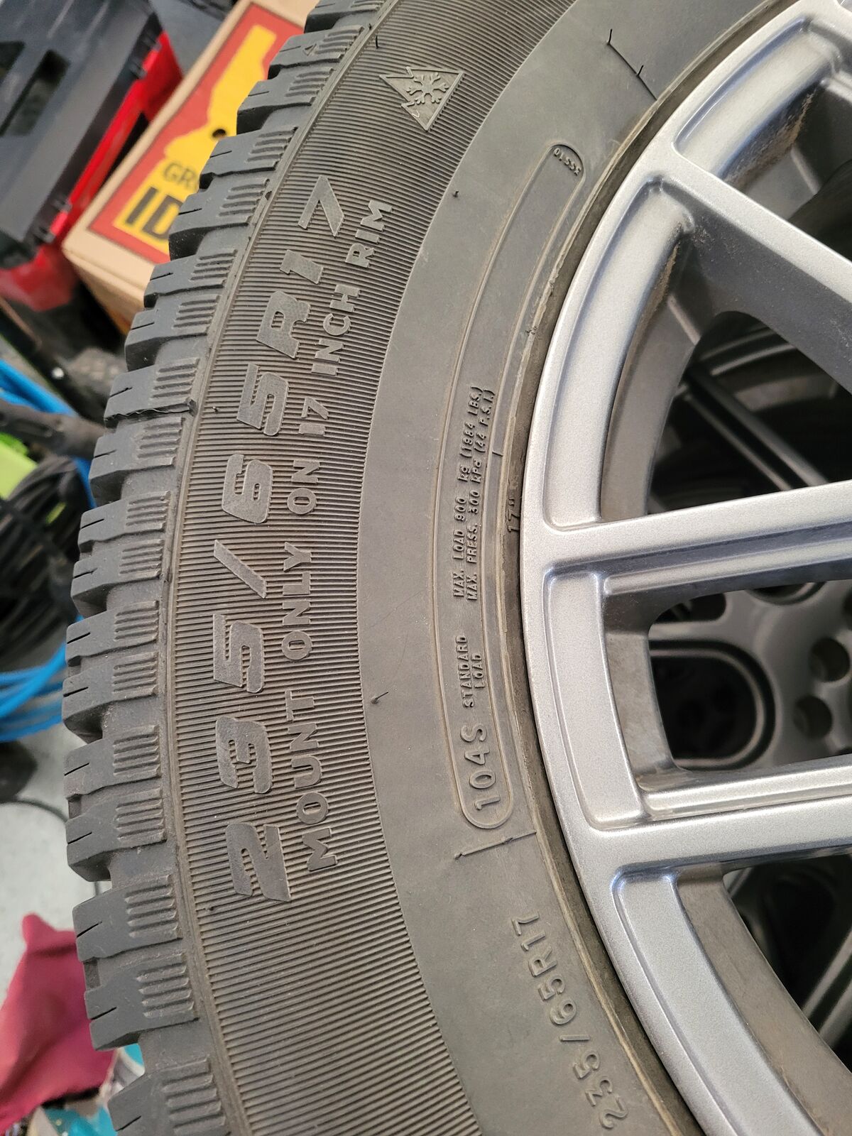 4 Studded SnowTires and rims 234/65R17. These tires still have a good amount of tread remaining. They came off a 2016 Acura MDX, but they won't fit on our new MDX. $375. No scam calls please.