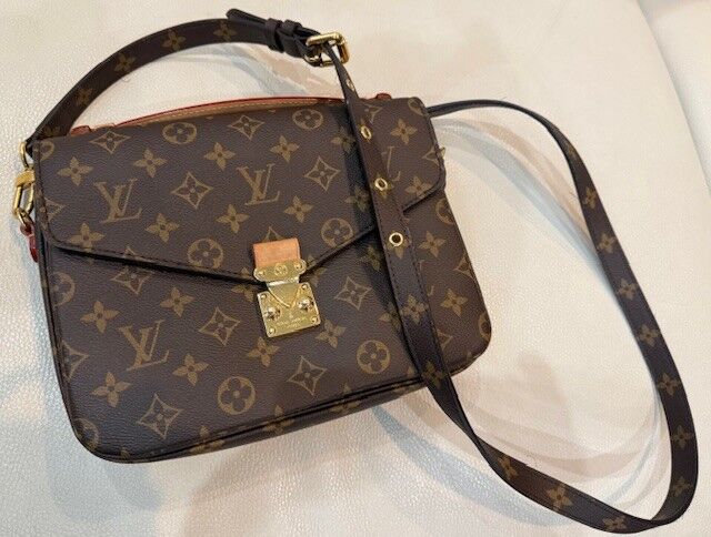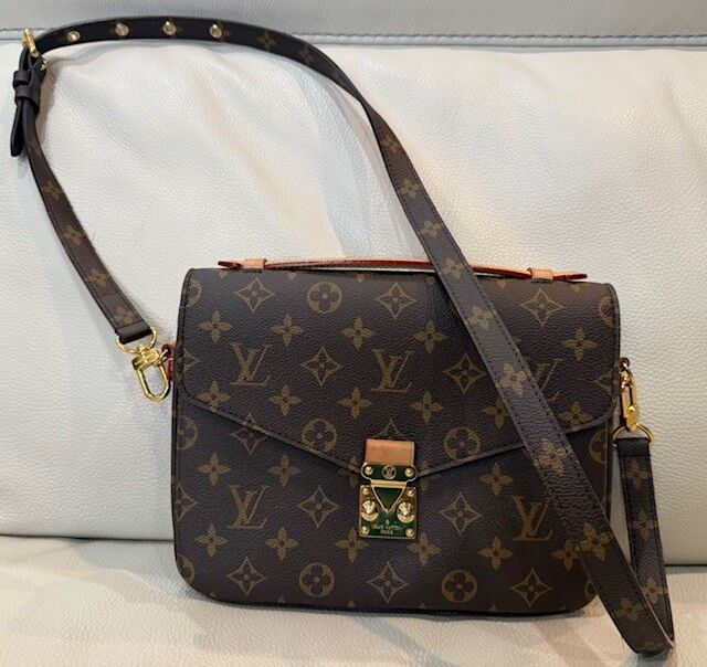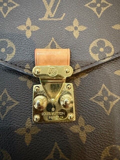 This LOUIS VUITTON Monogram Pochette Metis is in excellent condition. The crossover flap opens with a polished gold plated S-lock to a partitioned brown microfiber interior with a patch pocket. Retail (brand-new) price is $2,760. We're asking $1,935.