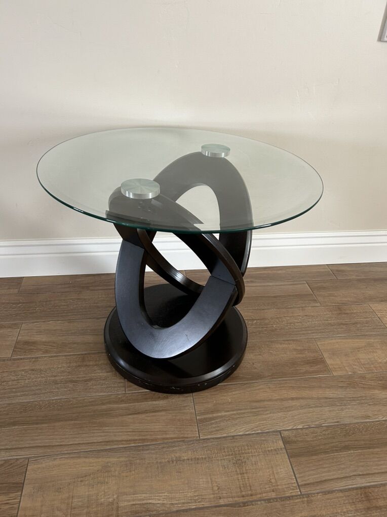 Selling this glass-top end table / coffee table that’s in good used condition. The wood base has a really unique architectural looking design with two merged oval shapes holding the glass top. (See pics)