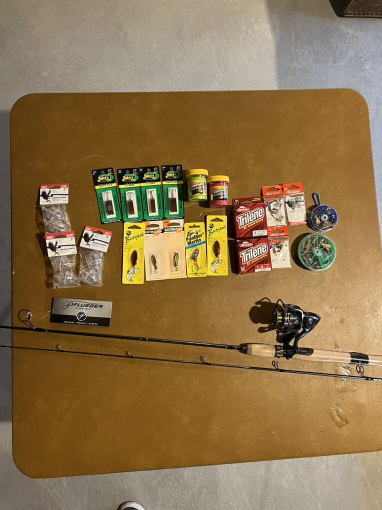 Flueger President 6’6” rod and reel combo with assorted lures and accessories.