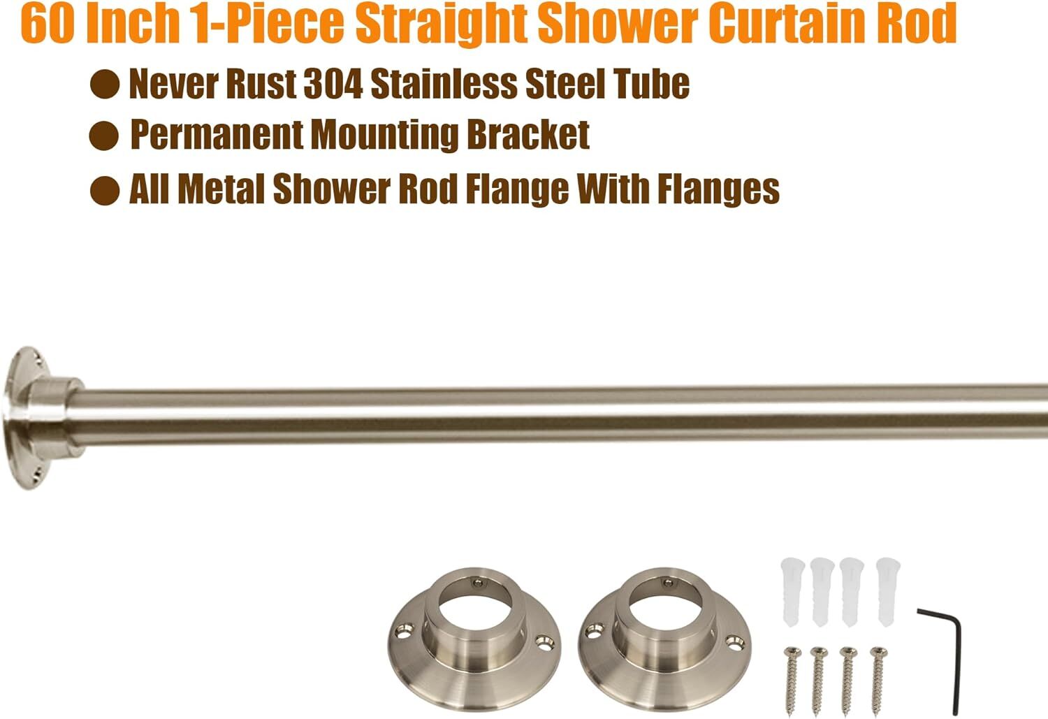 60” ONE-PIECE STRAIGHT SHOWER ROD: Lenght: 60 Inch one piece shower curtain rod is the ideal for fit standard 5 foot tub areas and showers spaces, unlike all two pieces tension shower rod, shower curtain would always get caught at the joint of the shower rods, this one-piece shower curtain rod without any joints, the shower curtain hooks can be glided over the one piece shower rod effortlessly, you can open or close your bath space easily.
