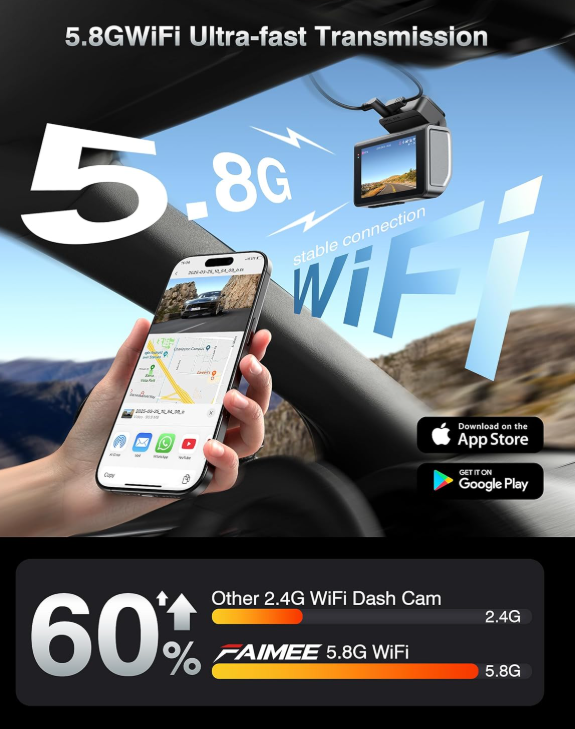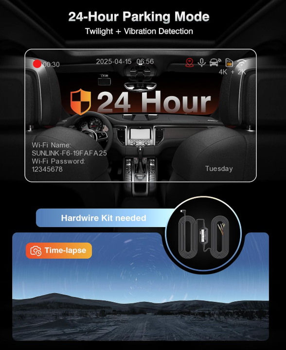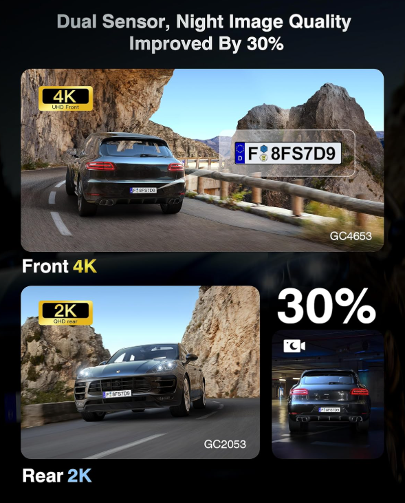 Zelle4K+2K DUAL RECORDING ULTRA SHARP AND EXTRA WIDE VIEW: Adopting f1.5 ultra-large aperture and excellent optics, the 4K Dash Cam front and rear dual lenses are utilized to capture every detail, providing 170°wide-angle coverage for 6-lane road visibility. Enhanced WDR and sharper night vision technology ensures crystal clear images in low light or high contrast conditions (e.g. tunnels, nighttime driving), ideal for accident forensics or scenic travel.