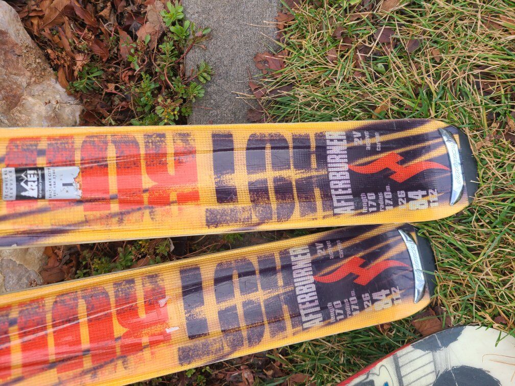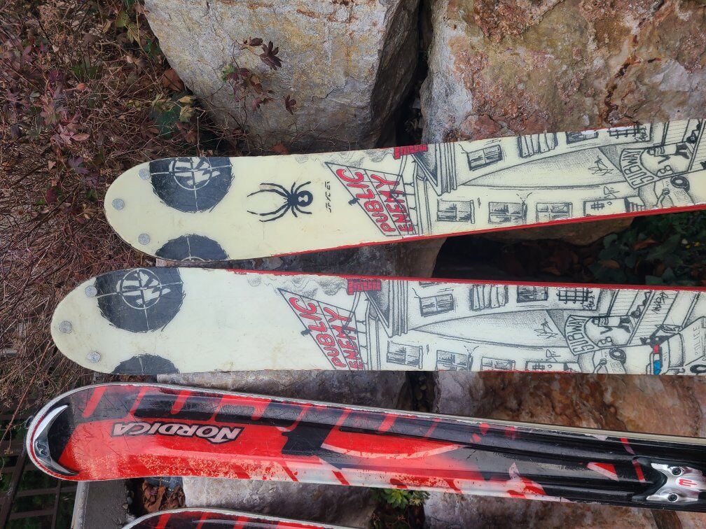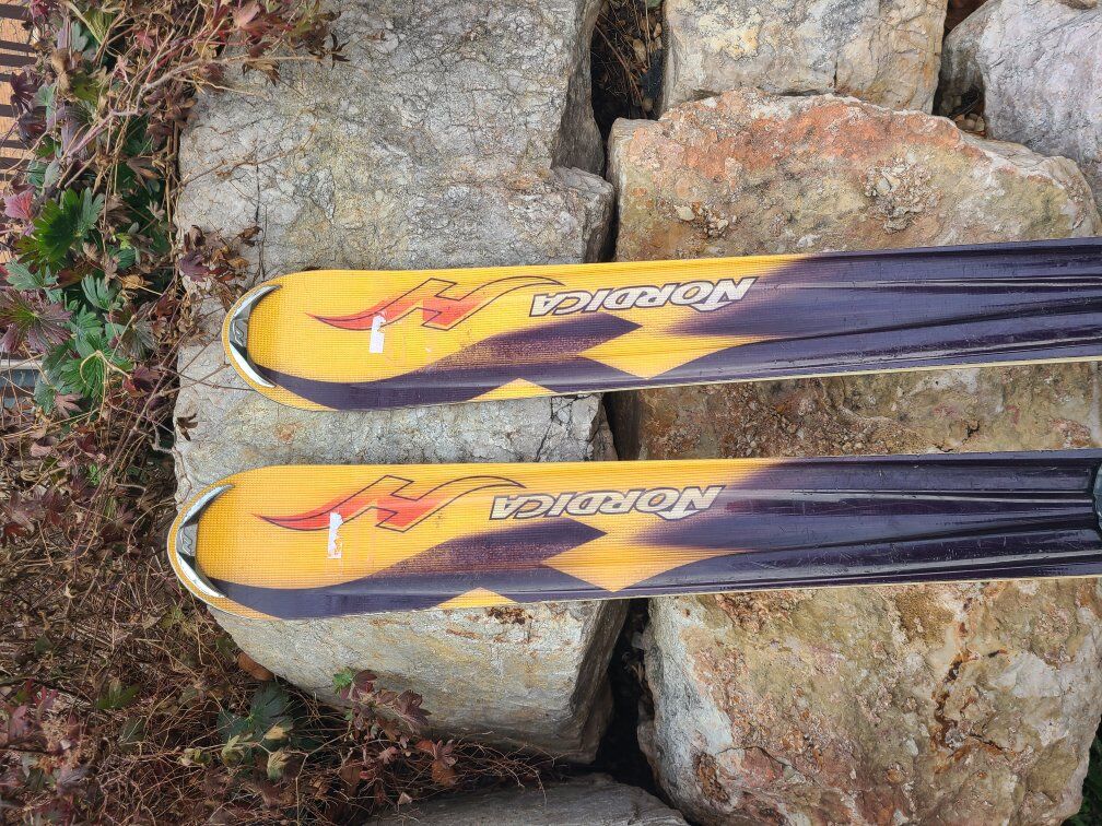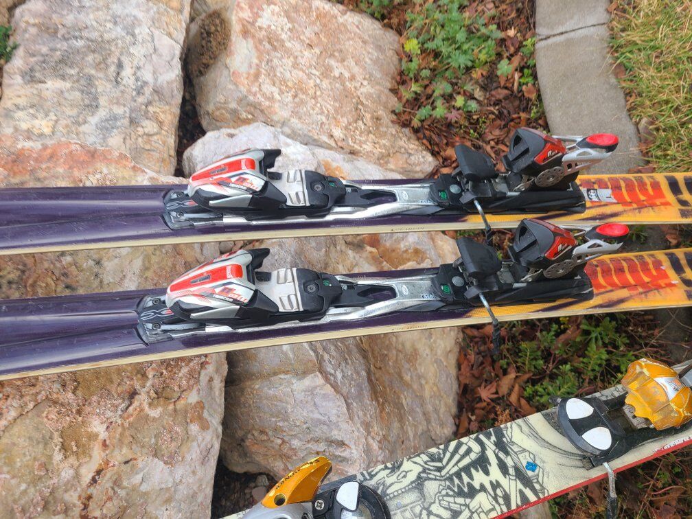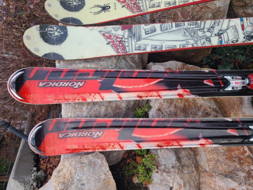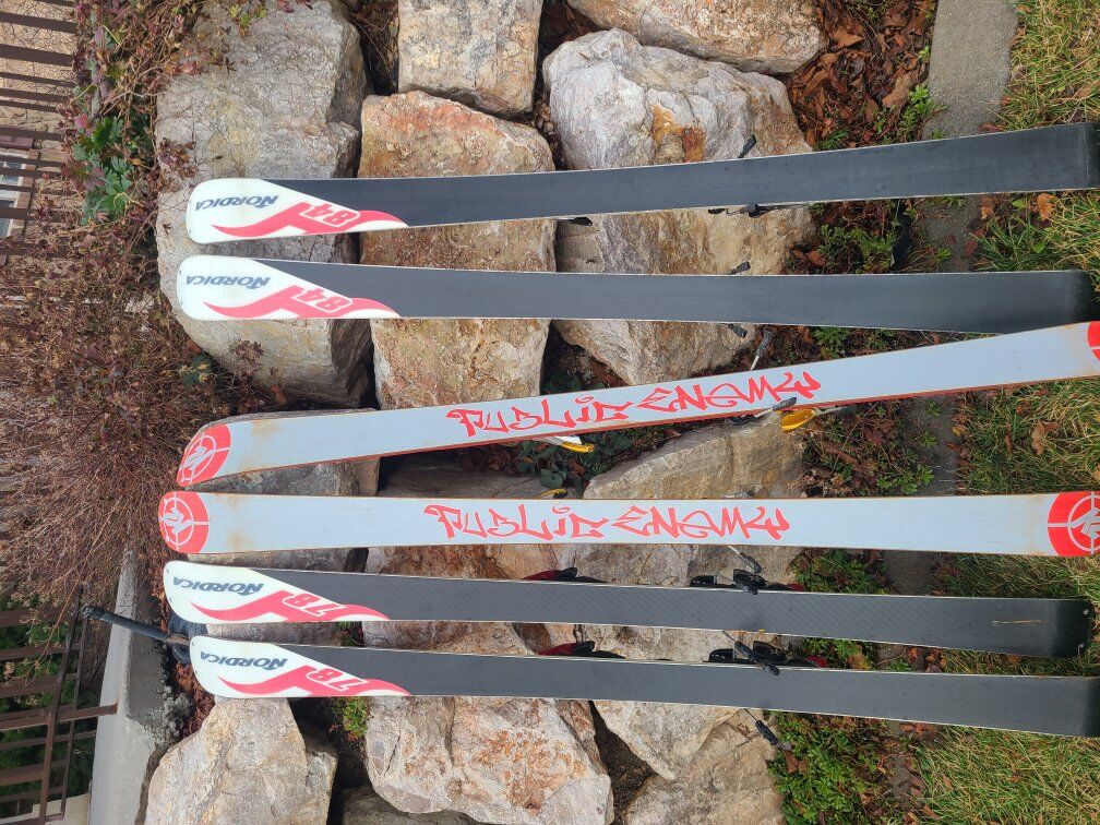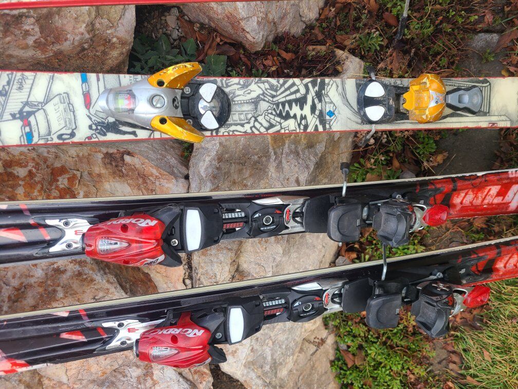 left to right Red nordica hotrod top fuel, 170cm, sode cut 124 78 100, r16. comes with matching easy adjust nordica bindings. $150