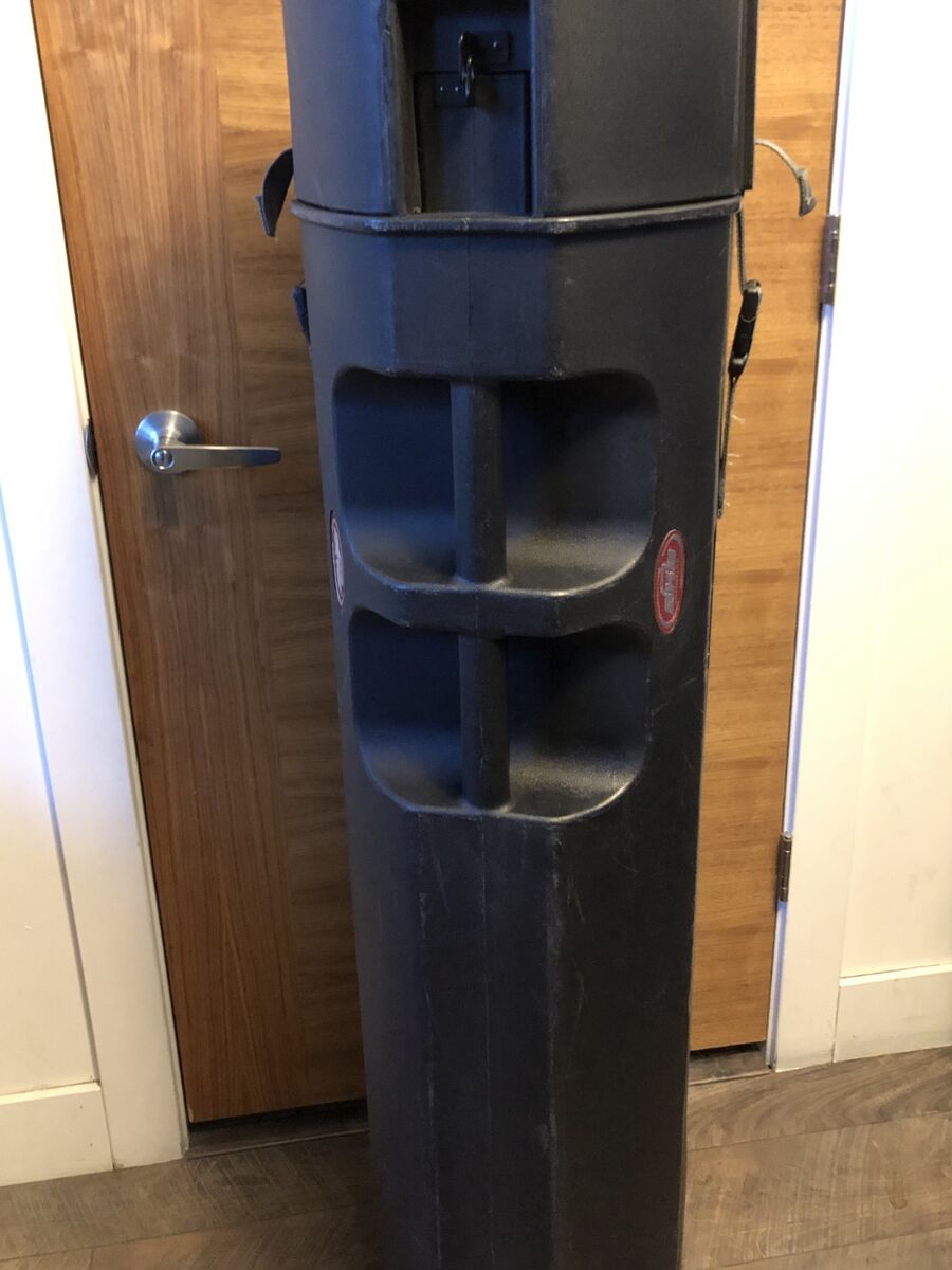 This is a heavy duty SKB travel case with wheels meant to carry extended length tripods but works excellent for golf clubs with a bit of room at the top for some extra gear. This case is 54” long (about 5” longer than the SKB standard golf case). Will fit standard size stand bags and cart bags. Will not fit oversized staff cart bags. Padded foam on the inside of the removal top (as shown). Case has no latches but does have the option for your own padlock for security (as shown).