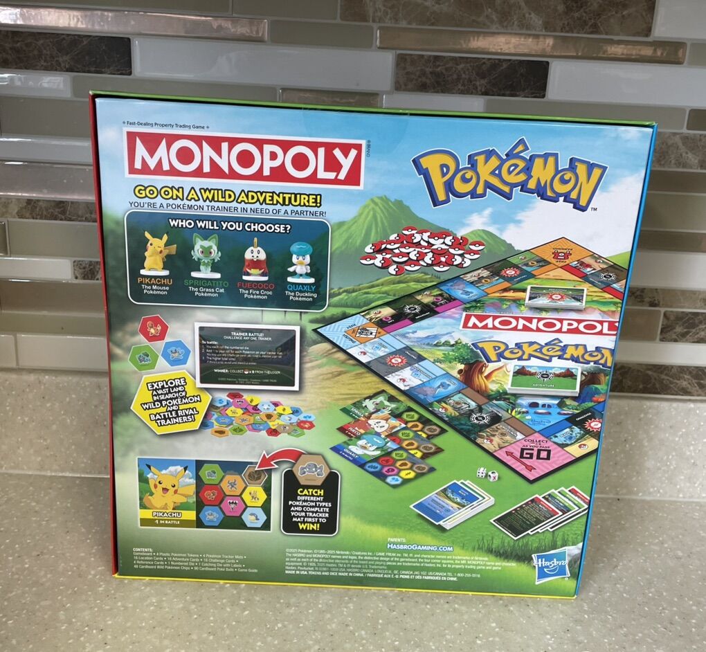VenmoMonopoly Pokémon Edition board game. • Combines classic Monopoly gameplay with Pokémon-catching action. • Players adventure as Trainers, explore locations, and collect Poké Balls. • Properties are locations, and Poké Balls replace money. • Features Sprigatito, Pikachu, Fuecoco, and Quaxly characters on the box and as tokens.