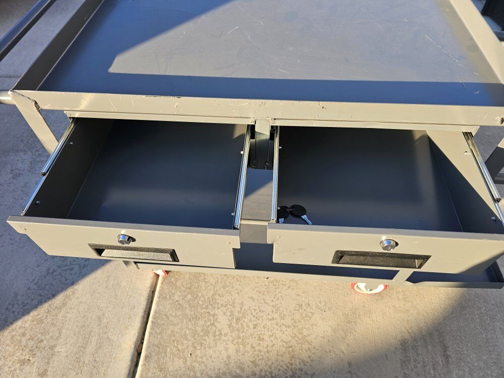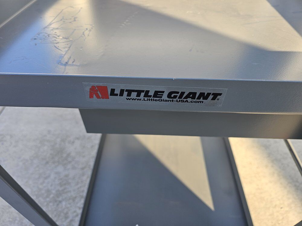 little giant wire reel utility cart. Used slight bend in bottom shelf casters all working well 2 locking drawers with keys