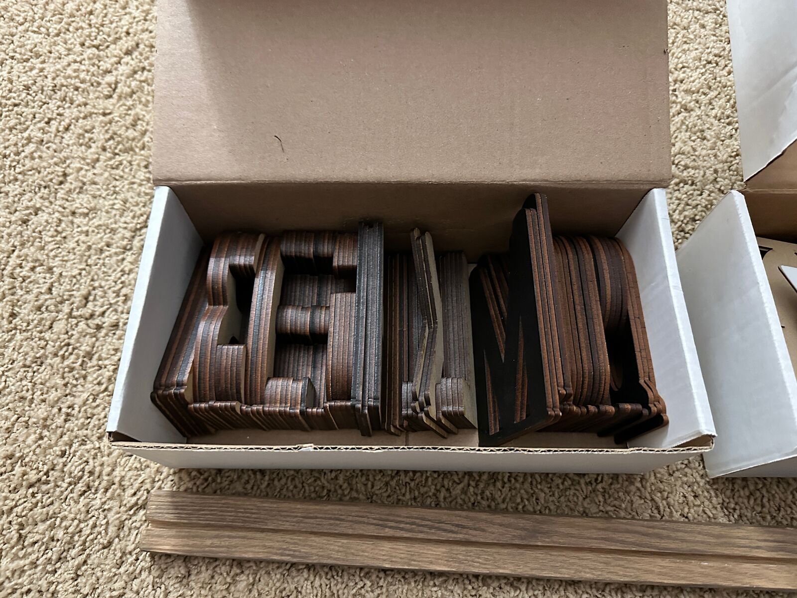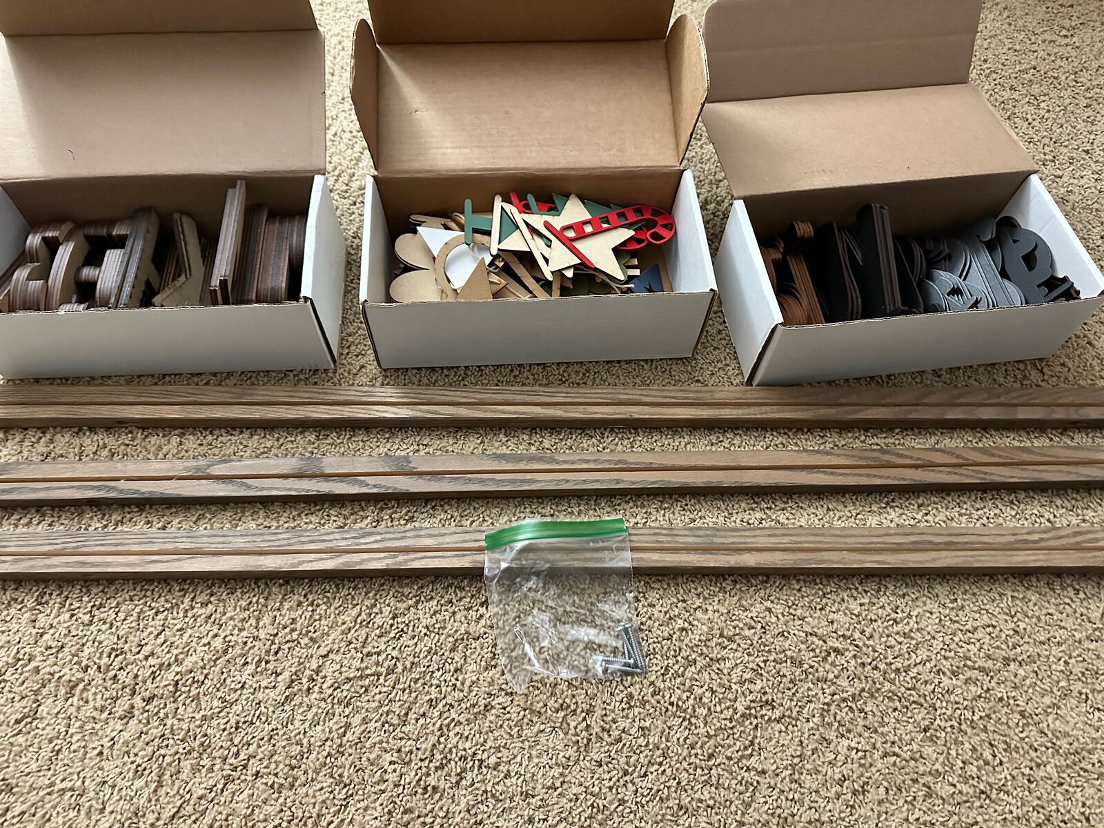 Includes three solid wood ledges, each 4 feet long, finished in a natural wood stain. The ledges mount to the wall and have a groove for letters to sit in and lean against the wall for a clean, minimalist look.