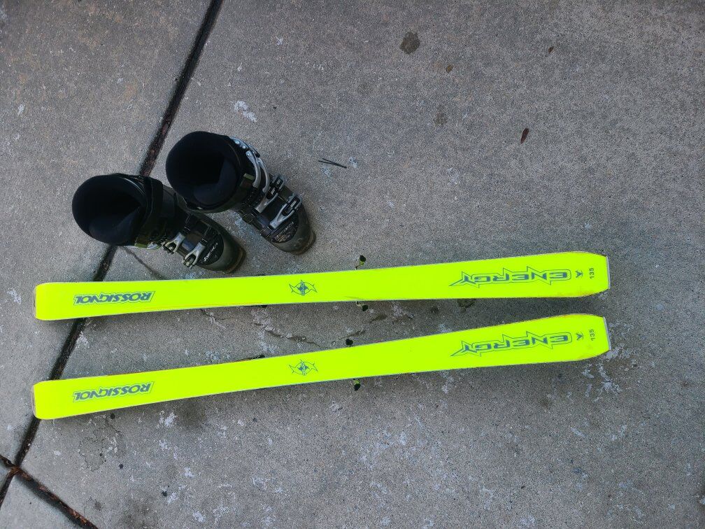 135cm skis, rossignol energy skis comes with adjustable bindings, I can help adjust to boots. boots shown are 23-23.5, but I have other sizes, just let me know what you need, or shoe size if you don't know sizes.
