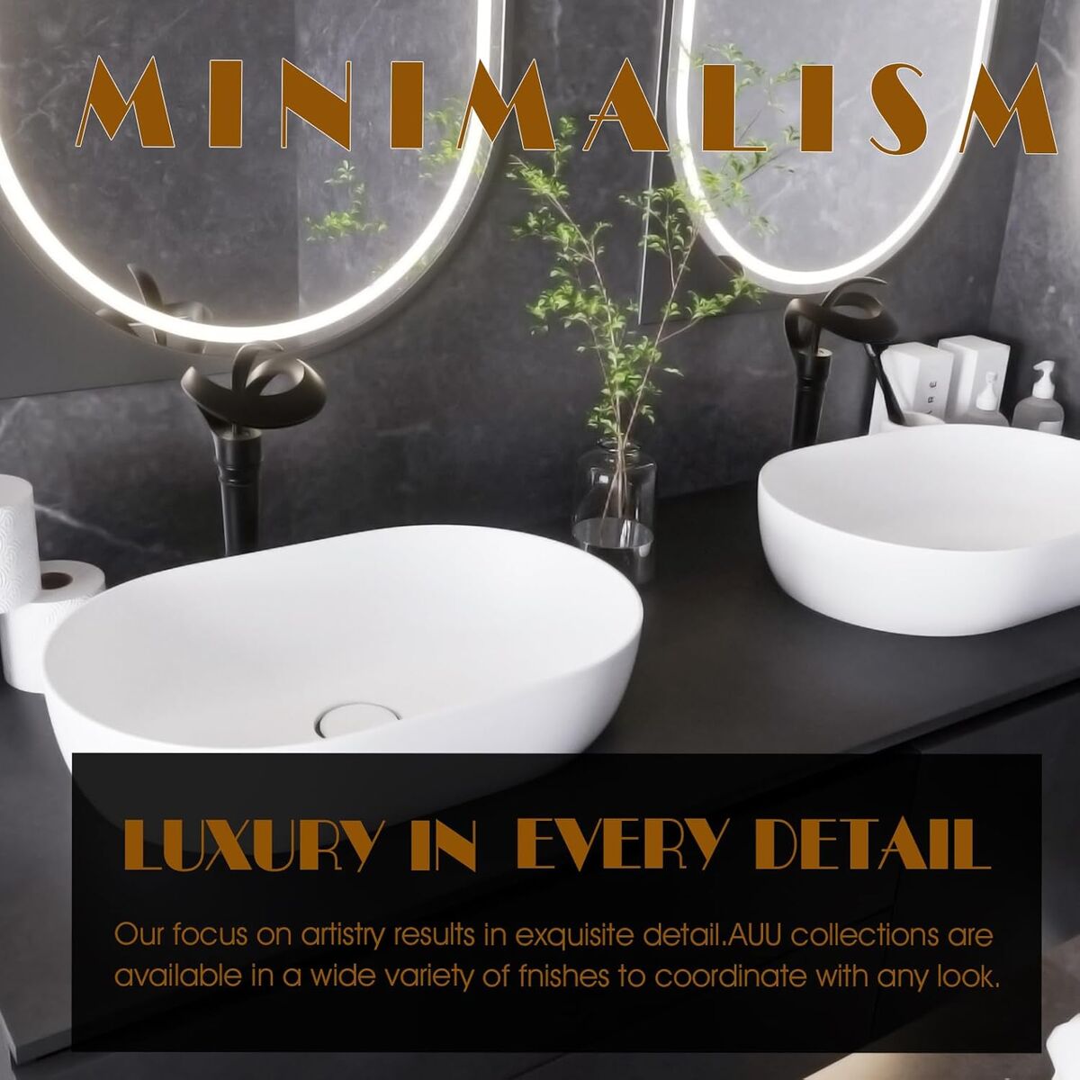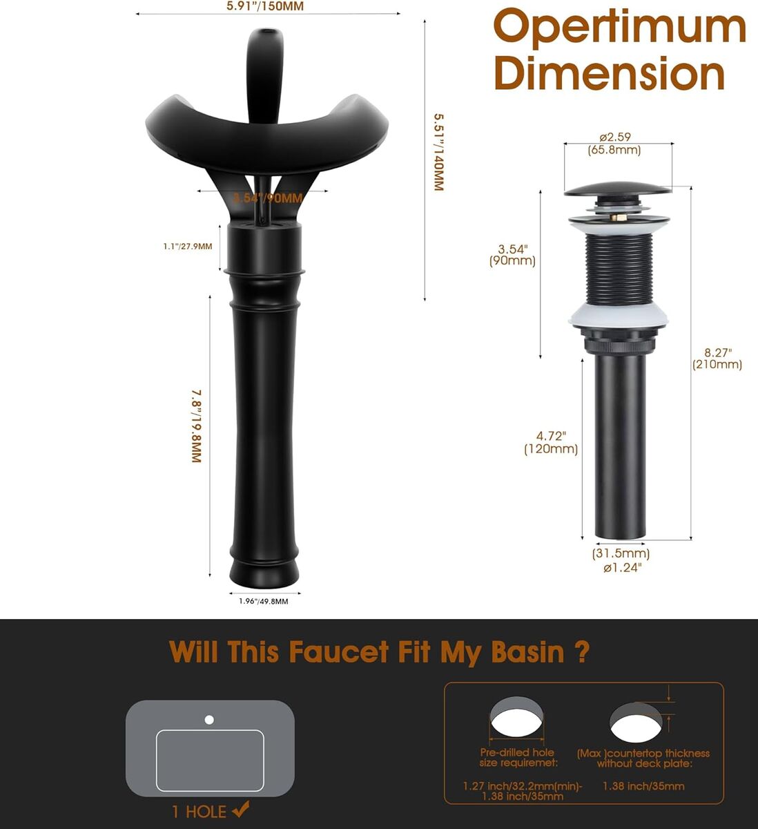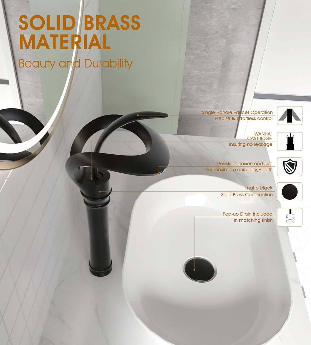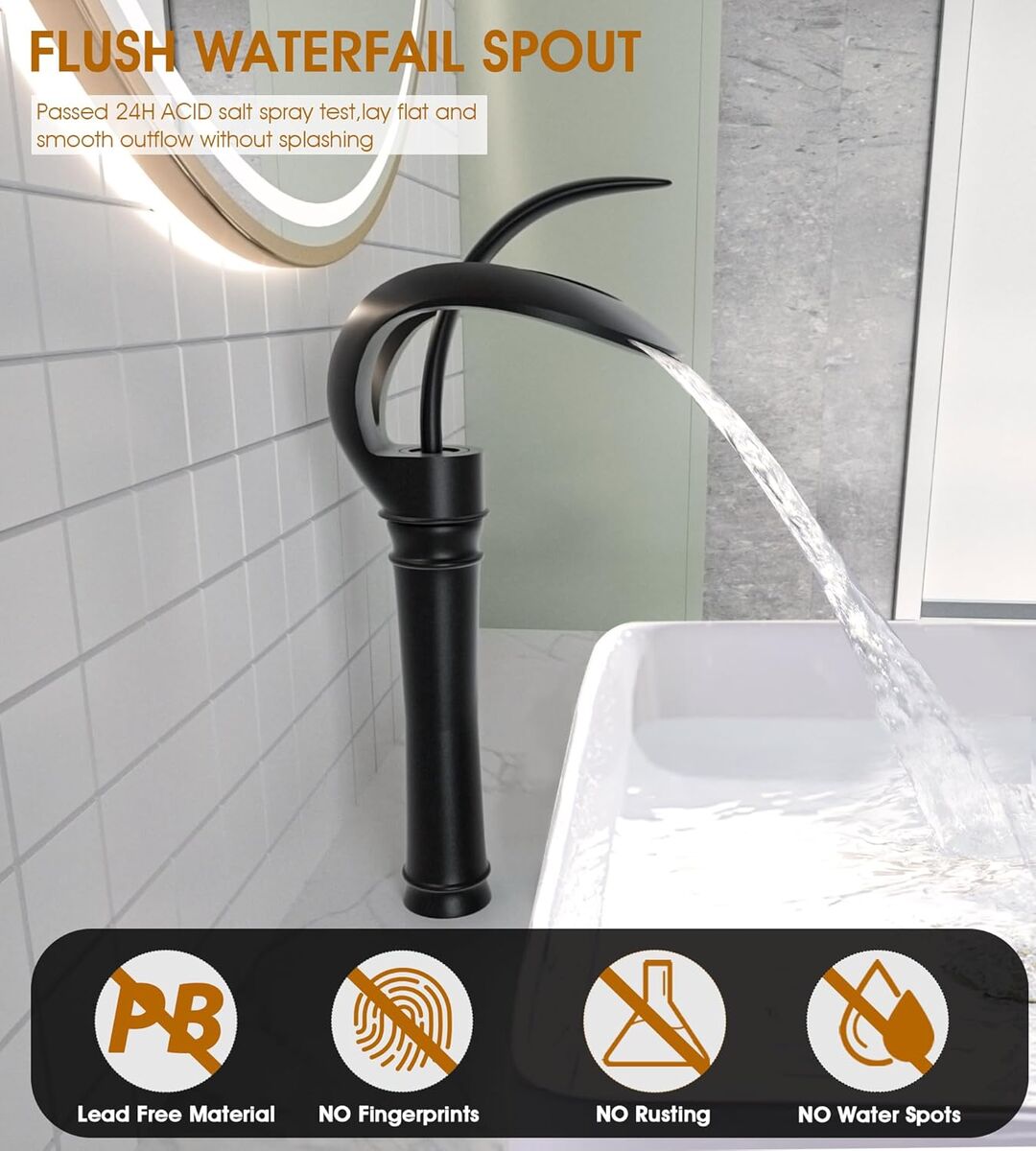 ApplePayElegant Bathroom Sink Faucet Single Hole,AUU Waterfall Matte Black Vessel Sink Faucet Solid Brass,Single Handle Tall Bowl Sink Faucet with Pop Up Drian Supply Line (Black, Tall)