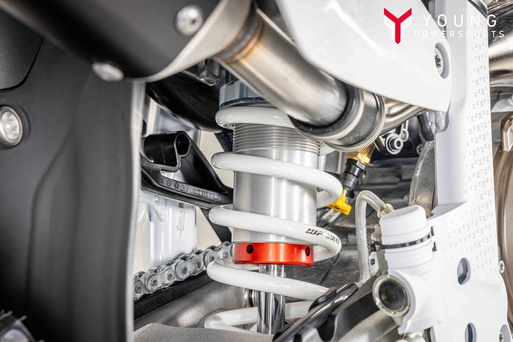 The proven chromium molybdenum steel frame is refined for 2023. A new shock mounting, which is no longer connected to the main tube, significantly improves the anti-squat behaviour of the chassis. With optimised wall thickness in high stress areas improving reliability, the frame continues to offer advanced geometries and flex characteristics aimed at providing unparalleled rider feedback, energy absorption, and exceptional straight-line stability. The frame is finished off in a premium white powder coating with redesigned standard frame protectors offering superior protection, durability, and grip in any condition. Additionally, the inclusion of forged brackets on the lower frame rails allows for easy installation of the skid plate, which is available as a technical accessory.