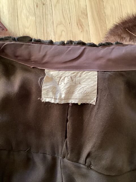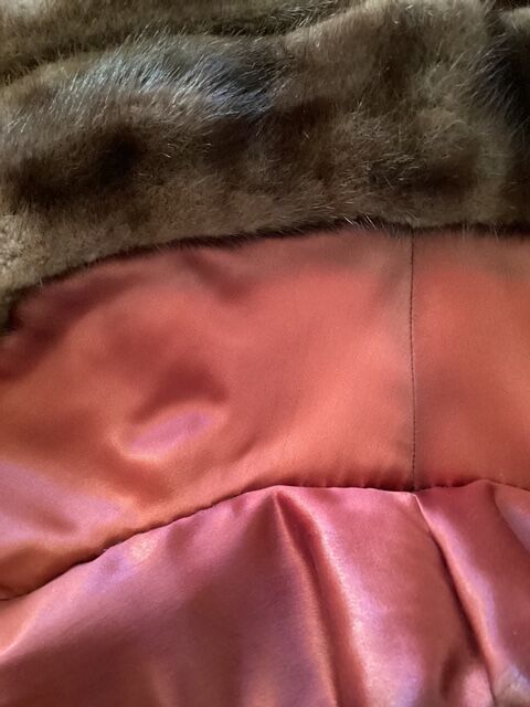 This Vintage Woman's Genuine Brown Mink Fur Cape is in Excellent Condition and is Beautiful. The fur is sewn in layers each with it's own lining and then together. It drapes over the shoulders crosses in front and gracefully hangs down. The inner lining throughout the cape is in good condition, and is the color shown in the picture. The purchase tag shown in one photo is lose on one side, but don't see anything else that is unsowen. There is a pocket on each side of the cape that hangs down. Good for holding glasses, keys, small coin purse or etc. There are two straps that are used to put your arm through as you put on the cape, or can be used to hang on the hanger. The hanger shown will go with it.