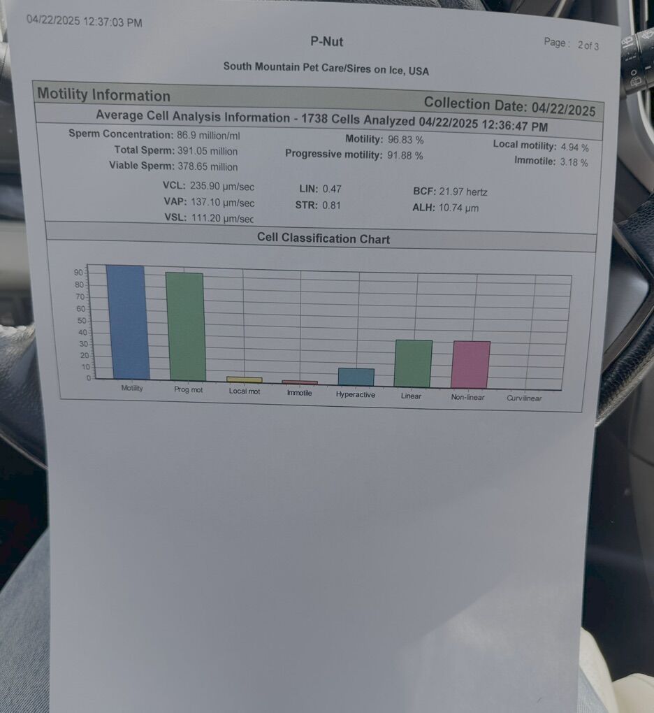 Shipping Available: We ship chilled semen across the U.S. regularly with excellent success often multiple times a month with large litter sizes. Stud fee + shipping paid by dam’s owner. (Note: Pregnancy not guaranteed on shipments due to shipping and variables outside our control, however our repro vet will approve the collection before shipping.)