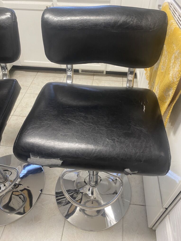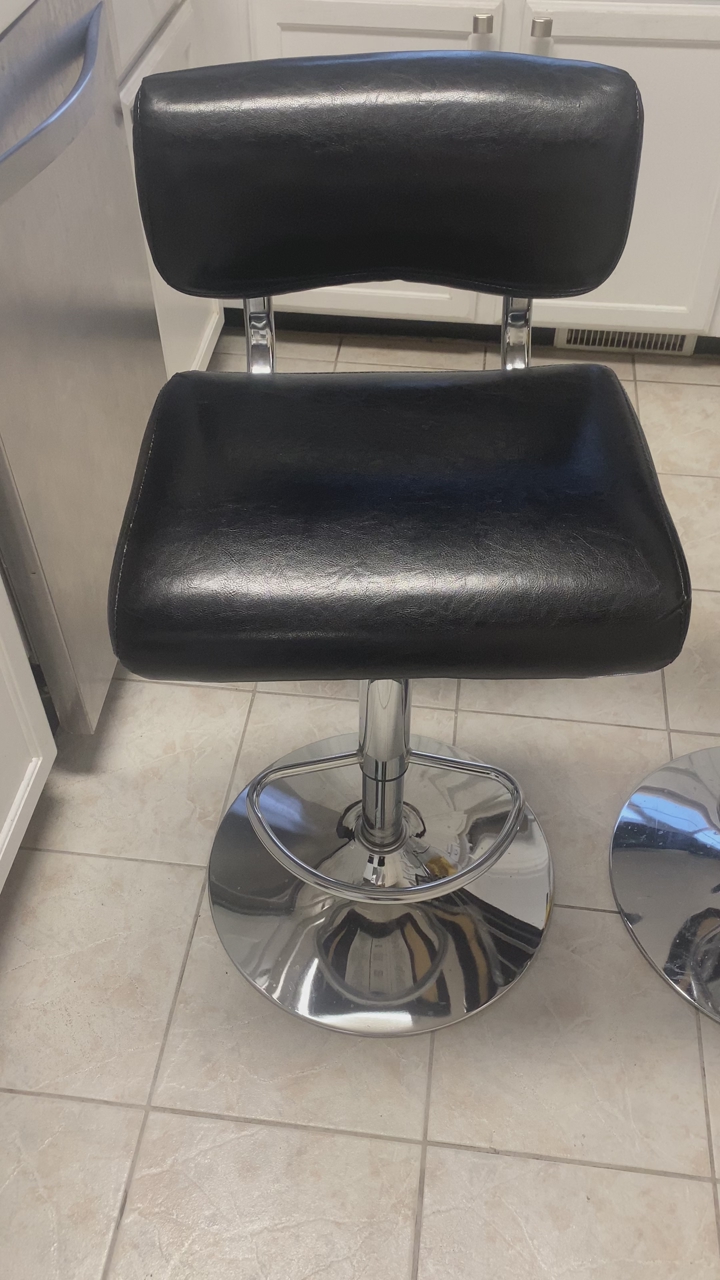 Venmo2 black bar stools swivel and adjustable height. One stool has a few tares as shown in the photo.
