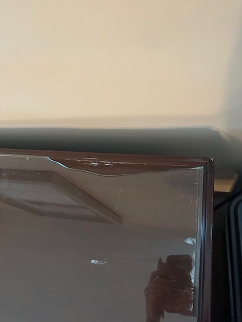 Has a glass top about ¼ inch thick. The glass did get broken at the back and a piece is missing but still usable. The desk is in pretty good shape maybe a little restoration needed. It has seen a few bumps and scraps.