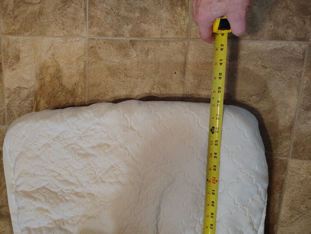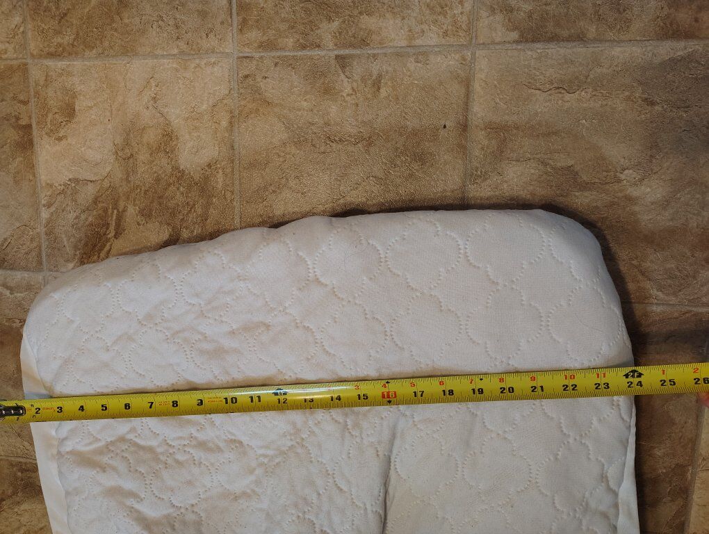 ZelleThis mattress is in very good condition, without stains. It says 'organic cotton' in embroidery. A fitted cover is included. 24" x 38" x 4"
