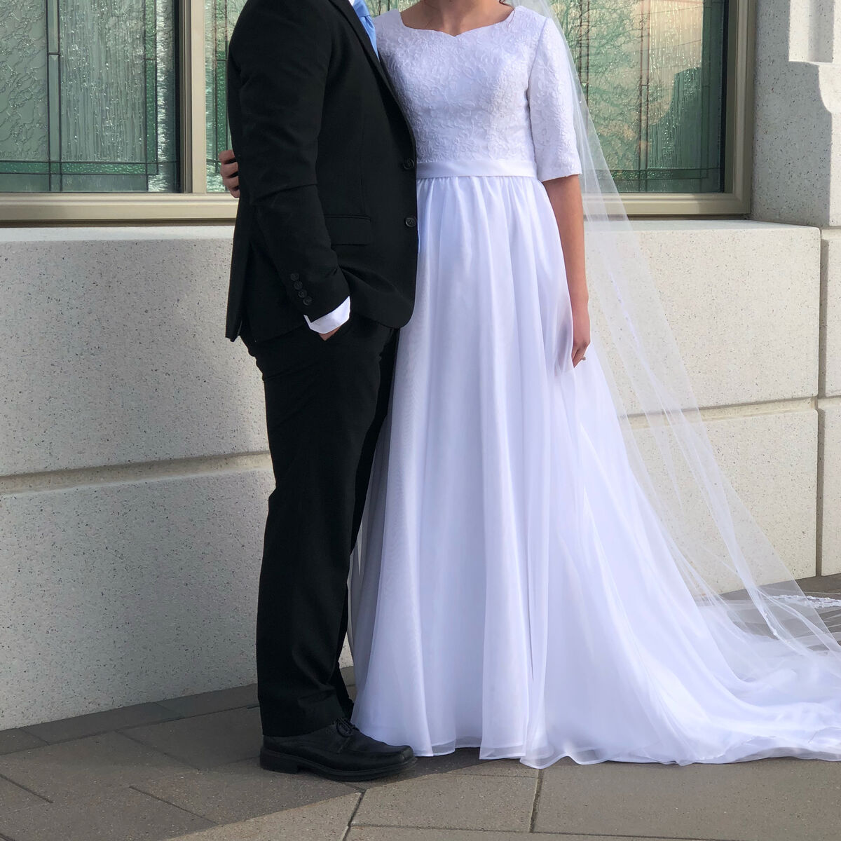 ApplePayGarment friendly wedding dress. Model is 5’4ft tall, and weighs 125lbs in pictures. Model is a dress size 6. Dress is in good condition, only wore once.