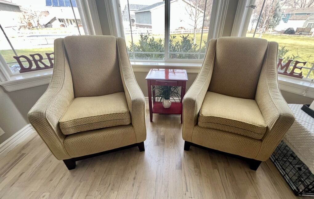 VenmoSturdy, soft yellow matching chairs, comfortable and stylish. But Worn on arms and cushions but no holes or tares. I will professionally clean them up before selling. $50 each please ($100 for the pair).