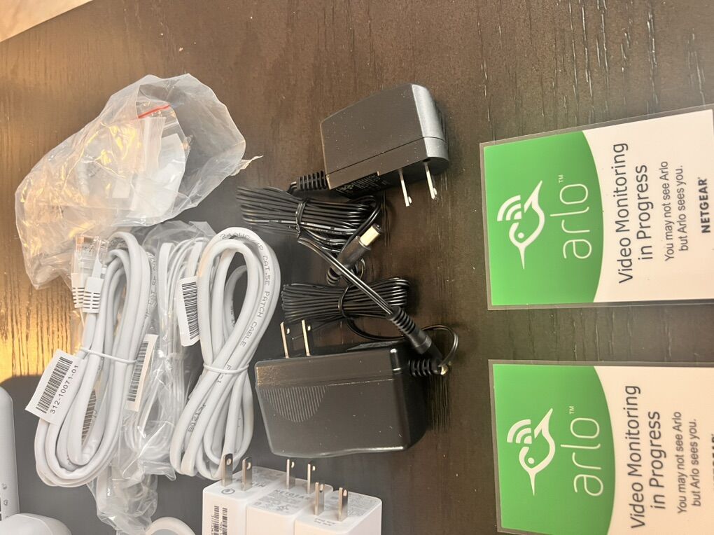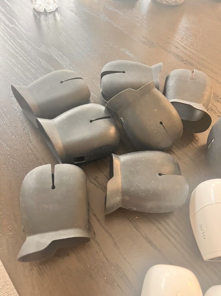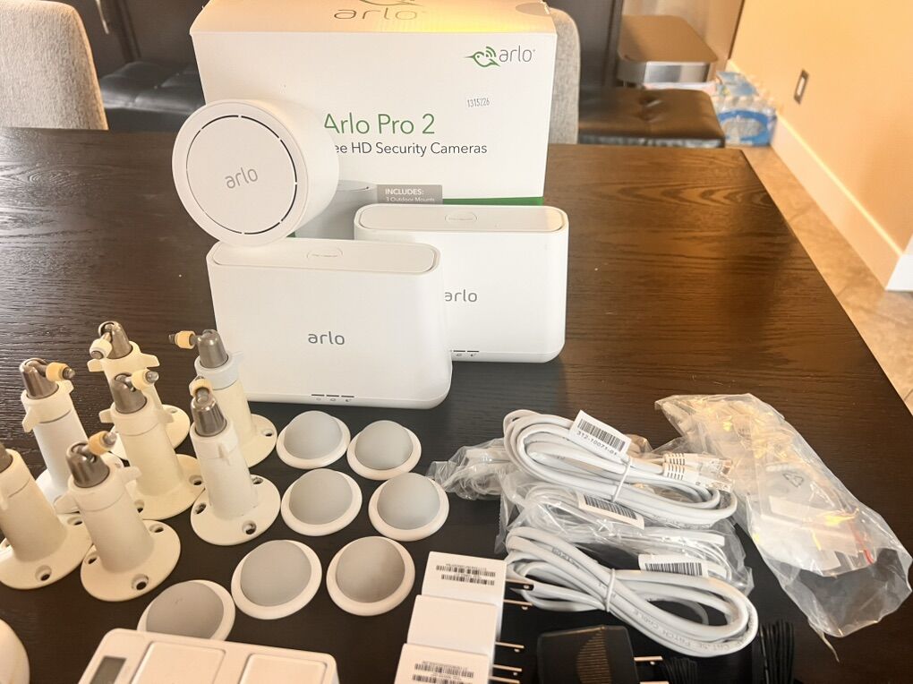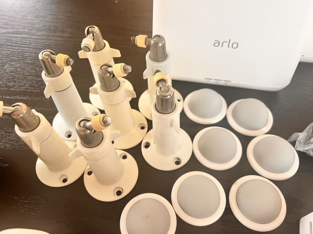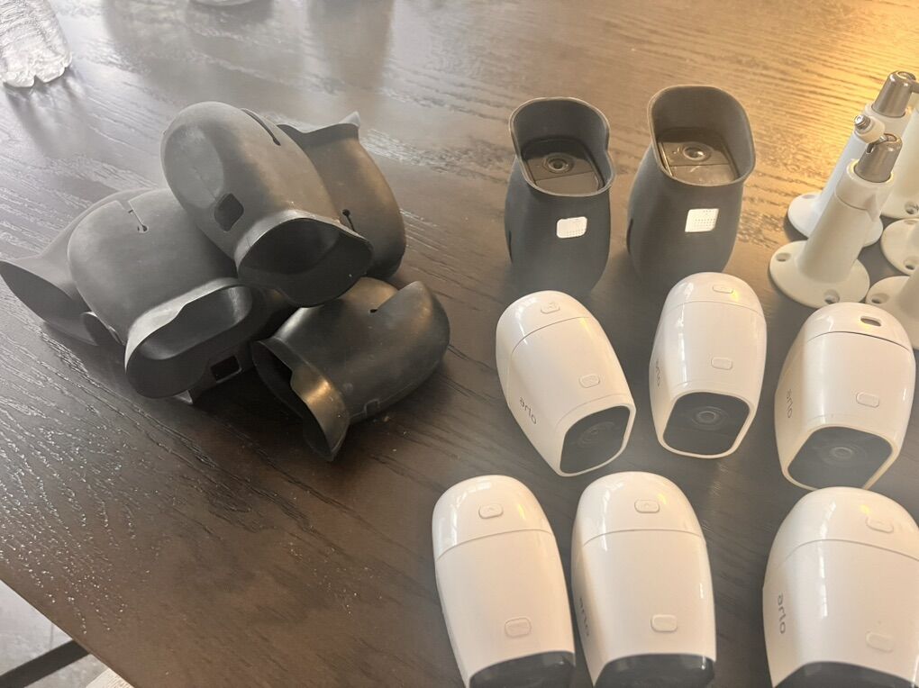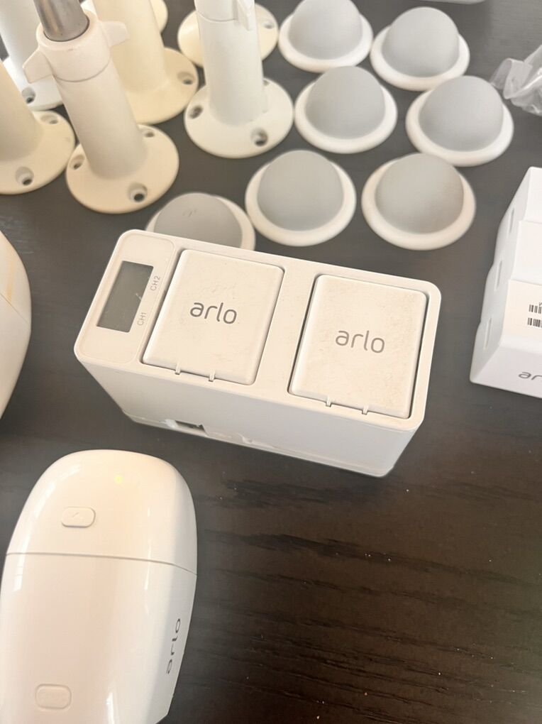 Nine Arlo Cameras with black silicon protectors, includes: Outdoor Mounts Indoor Mounts Battery charger 2 extra batteries 3 home bases ( you can connect all the cameras into one home base or set up the cameras using the 3 home bases) Ethernet cables Charging cables Arlo stickers These cameras are in good condition and all working, you just need internet connection and to download the free Arlo security app to set them up.
