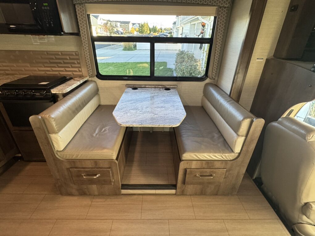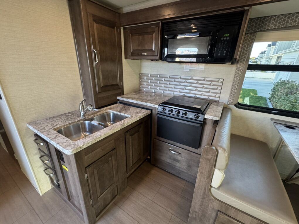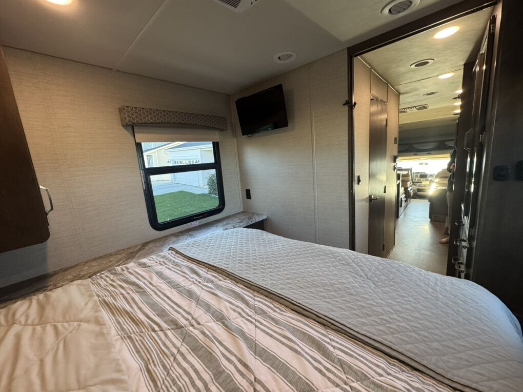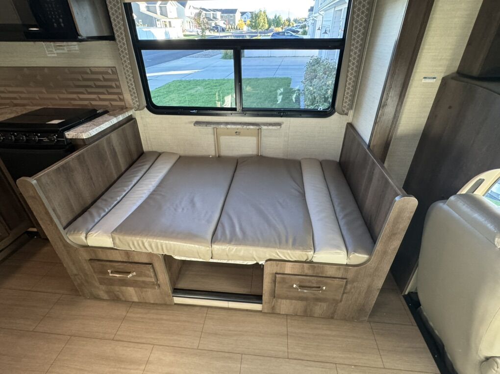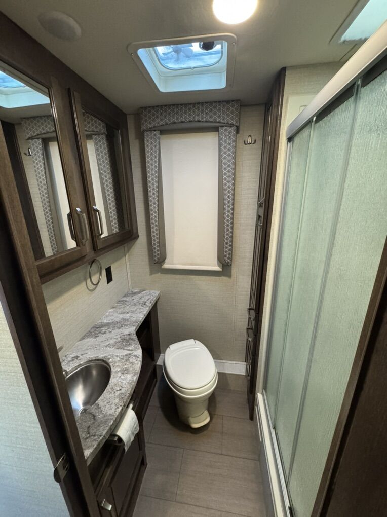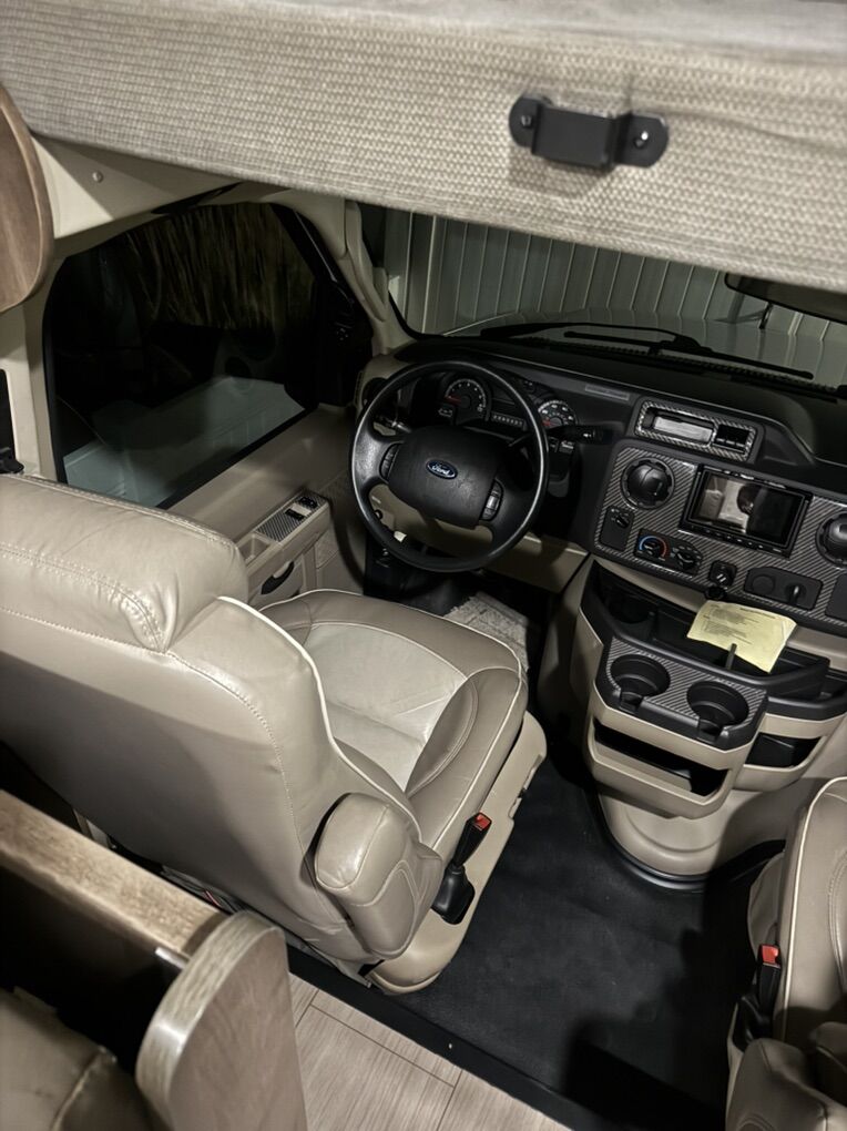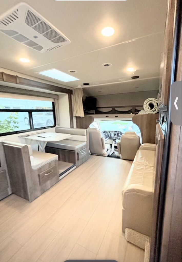 Big open layout with three slide-outs (creating an open living area with an almost Class A feel), awning, and features like a rear walk-around queen bed, cab-over bunk, and dual A/C units, designed to sleep up to 8, making it ideal for families or groups. Nice kitchen with fridge and freezer, stove, oven, and nice bathroom with toilet and shower. 2 tvs, great heater, water heater, self leveling system which is super handy, and nearly new tires. Always serviced, just aligned, and ready to go.