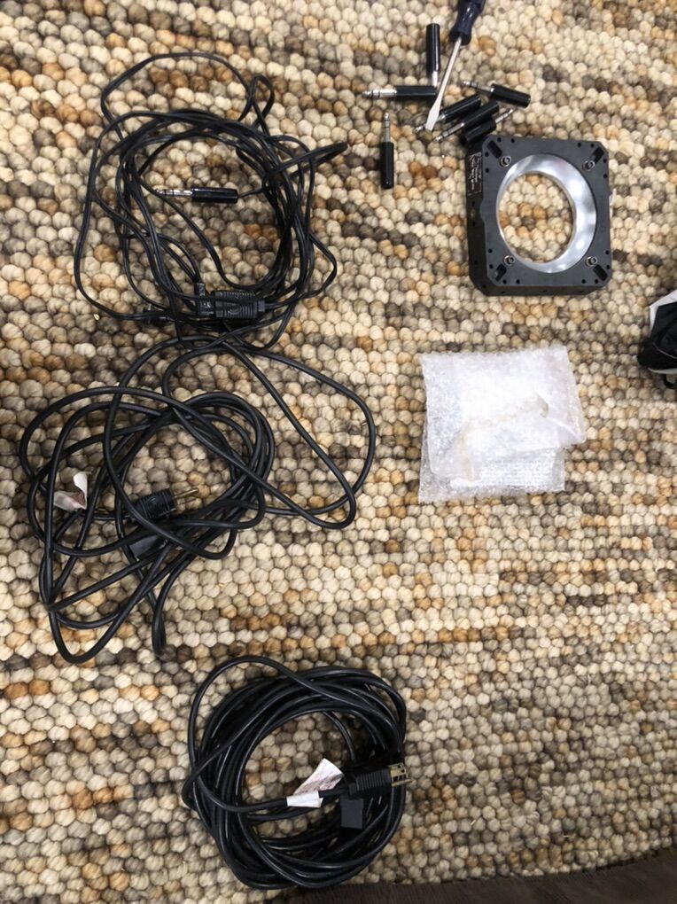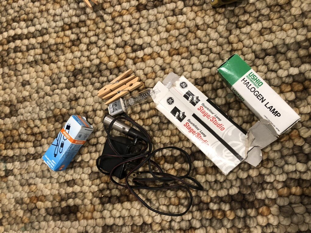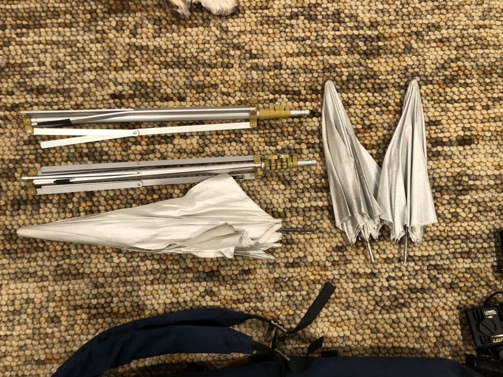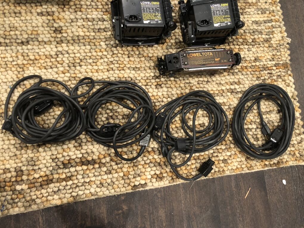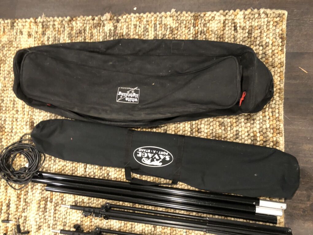 In bag 1 1 Lowel DP multi use, backlight, or background light 2 Lowel Omni focus flood 2 Lowel ilight 1 Lowel Tota tungsten flood light All power cords 3 stands, 3 umbrellas Extra bulbs