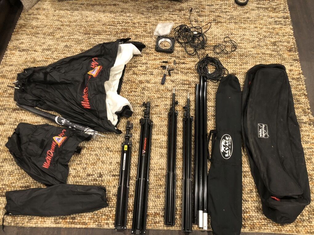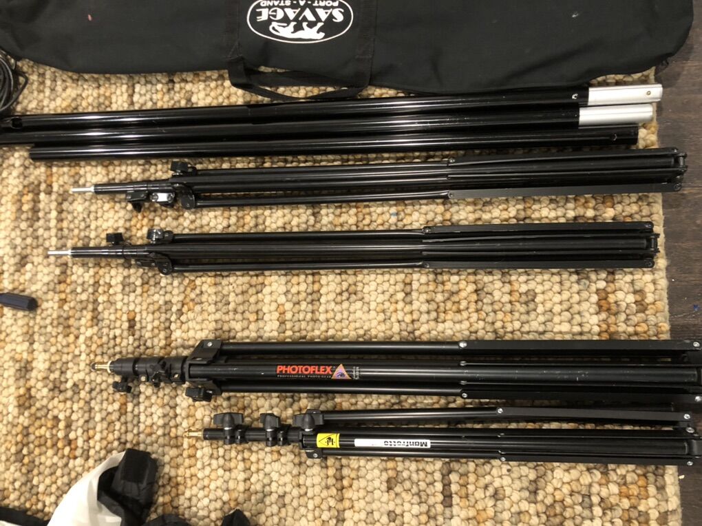 In bag 2 1 Savage port-a-stand 2 photo flex multi dome hv3, medium and large 1 manfrotto stand 1 photo flex stand 1 the eclipse umbrella All associated cords