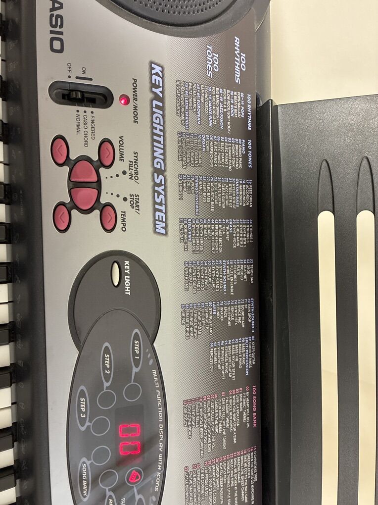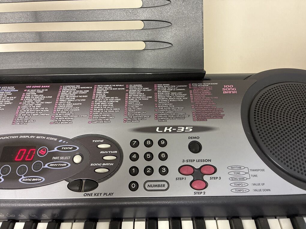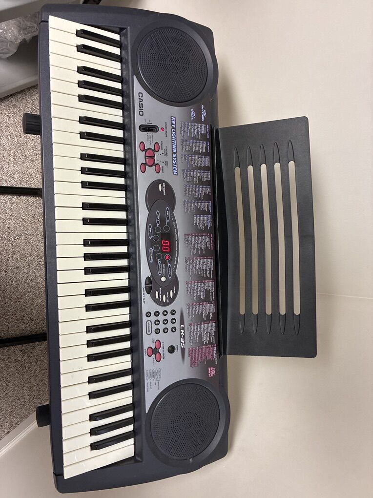 VenmoCasio LK-35 61-Key Lighted Keyboard - Stand and music back board •Key Lighting System: Features a built-in tutor that teaches users to play by following lighted keys. • Tones and Rhythms: Includes 100 built-in tones and 100 rhythms. • Polyphony: Features 12-note maximum polyphony. • Portability: Can be powered by an AD-5 AC adapter or six AA-size batteries.
