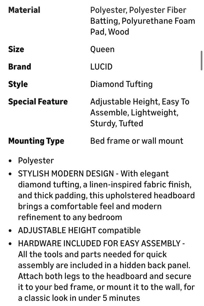VenmoBrand New Still In The Box Lucid Queen Size Upholstered Mid-Rise Diamond Tufted Headboard.