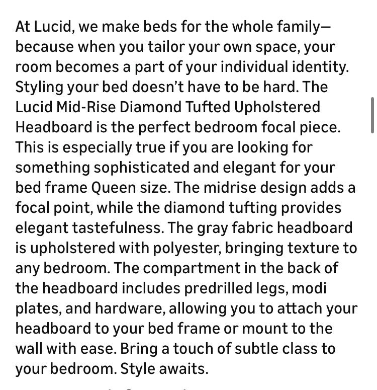 At Lucid, we make beds for the whole family— because when you tailor your own space, your room becomes a part of your individual identity. Styling your bed doesn’t have to be hard. The Lucid Mid-Rise Diamond Tufted Upholstered Headboard is the perfect bedroom focal piece. This is especially true if you are looking for something sophisticated and elegant for your bed frame Queen size. The midrise design adds a focal point, while the diamond tufting provides elegant tastefulness. The gray fabric headboard is upholstered with polyester, bringing texture to any bedroom. The compartment in the back of the headboard includes predrilled legs, modi plates, and hardware, allowing you to attach your headboard to your bed frame or mount to the wall with ease. Bring a touch of subtle class to your bedroom. Style awaits. See photos for dimensions. Headboard only, bed frame not included.