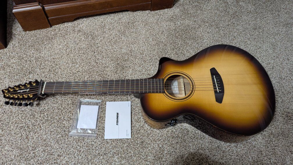 VenmoBreedlove Artista Pro Concert BA 12 CE - This Concert size cutaway 12 string guitar is part of the Breedlove Pro Collection in Mint to Excellent condition. Top is spruce with sunburst color in gloss finish. Back and sides are made with interesting grain of Myrtlewood. Fretboard is Ovangkol. Built in Electronics with tone, tuner, bass/treble controls and preamp. Comes with hardshell case.